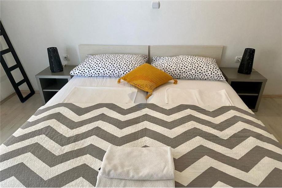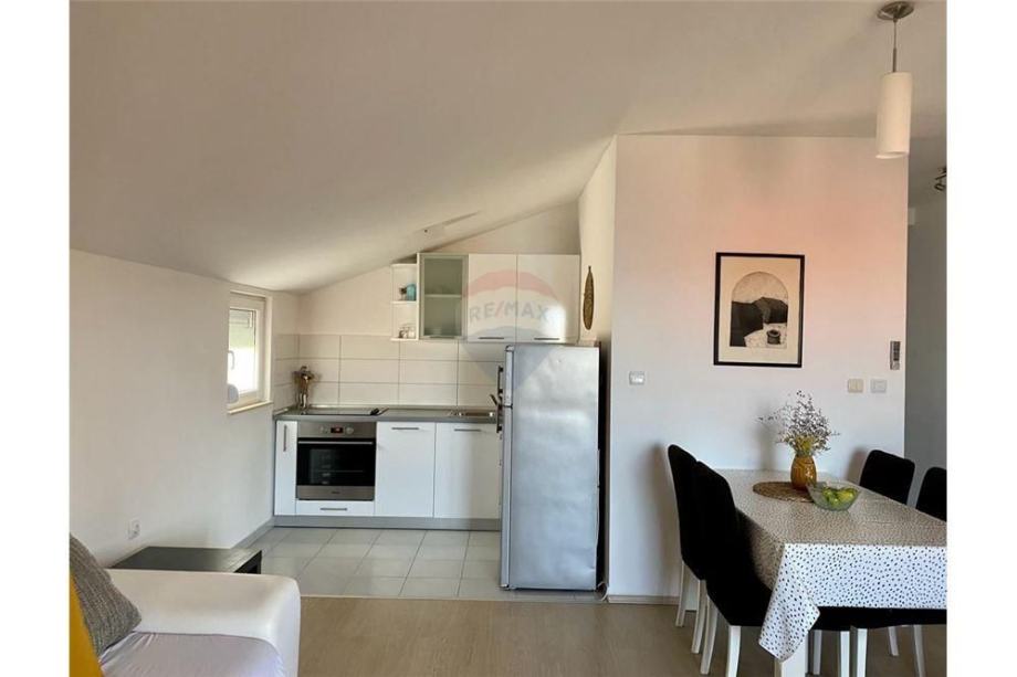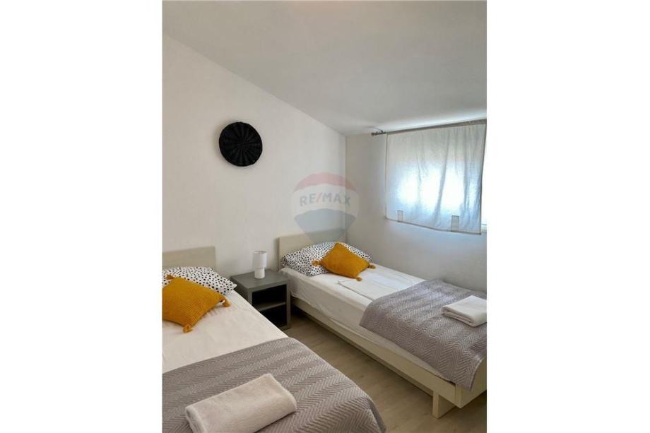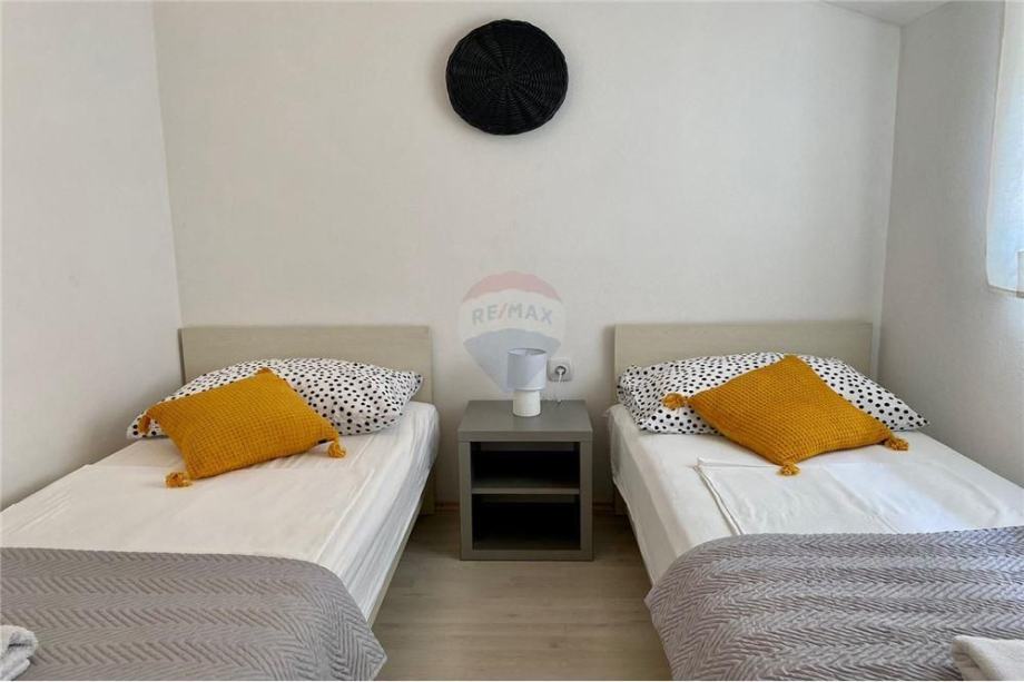 Apartman veličine 75m2, sastoji se od dvije spavaće sobe, kupaonice, dnevnog boravka, te terase sa pogledom na more.
