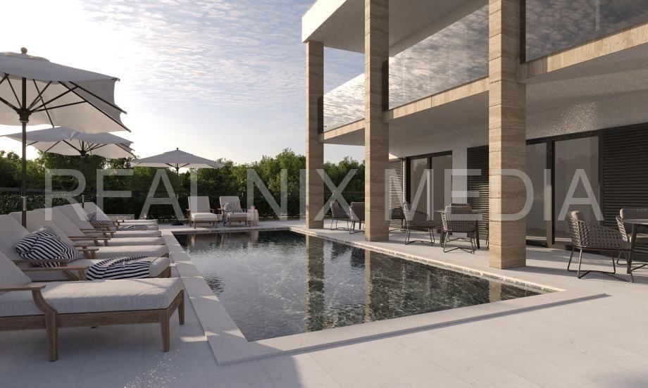 Netto površina ville iznosi 166,6 m2 te ju sačinjava prizemlje u kojem se nalazi kuhinja, blagovaonica i dnevni boravak sa izlazom na natkrivenu terasu i uređenu okućnicu gdje se nalazi bazen površine 31,5 m2; jedna spavaća soba, kupaonica, gostinjski toalet te unutarnje stepenice koje vode na kat kuće.