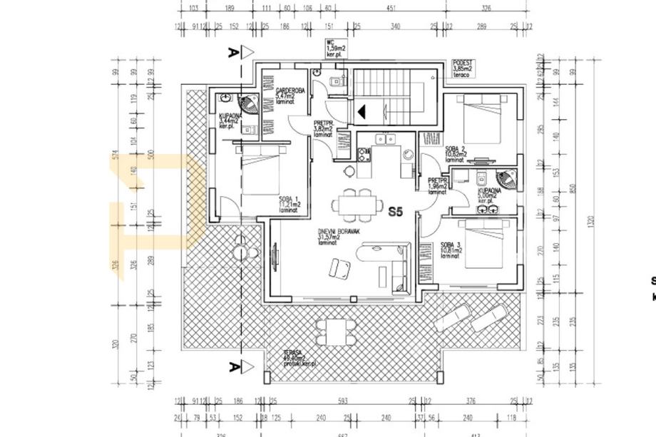 Ukupna površina stana iznosi 85,50 m², uz dodatnu terasu od 49,40 m², idealnu za opuštanje. Funkcionalan raspored obuhvaća prostrani dnevni boravak s kuhinjom i blagovaonicom, tri komforne spavaće sobe, dvije kupaonice, garderobu te zaseban gostinjski WC.