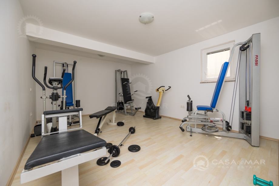 U suterenu kuće se nalazi jedan apartman, koji se sastoji od spavaće sobe i kuhinje, te teretana. U prizemlju se nalazi jedna spavaća soba, dnevni boravak, kuhinja i toalet, prvi kat se sastoji od tri apartmana od kojih svaki ima jednu spavaću sobu, kupaonicu i balkon sa pogledom na more, a u potkrovlju se nalazi jedna spavaća soba, kuhinja, kupaonica te velika terasa.