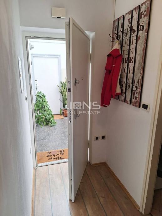Prostor je funkcionalno organiziran i ugodan za svakodnevni život. Dnevni boravak povezan je s kuhinjom i čini svijetao, otvoren prostor, dok spavaća soba ima izlaz na balkon s lijepim pogledom prema moru. Kupaonica i hodnik logično su uklopljeni u tlocrt, a dodatnu vrijednost nekretnini daje pripadajuća drvarnica.