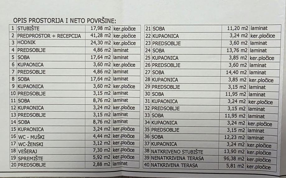 - hotel sa 24 sobe (projektiran prema standardu 5 zvjezdica, potrebno unutarnje uređenje i opremanje)