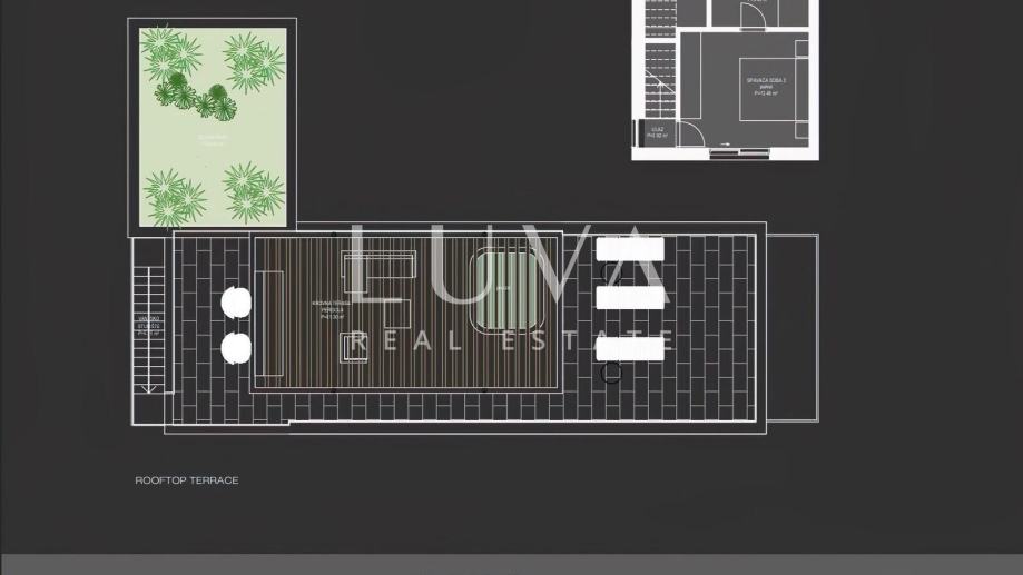 Penthouse je povezan unutarnjim stubištem, a uz njega dolazi krovna terasa od 91,30 m² s jacuzzijem, koja nudi potpuni ugođaj. Osim toga, na raspolaganju su dva parkirna mjesta.