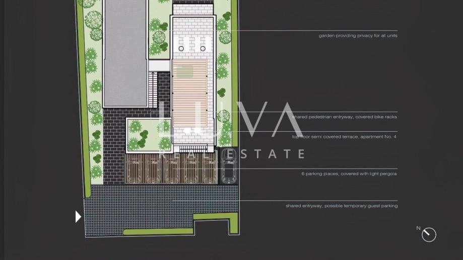 Za parkiranje su predviđena dva natkrivena parkirna mjesta s pergolama, a osigurana su i spremišta za bicikle. Također, planirano je zajedničko spremište za sve vlasnike objekta.