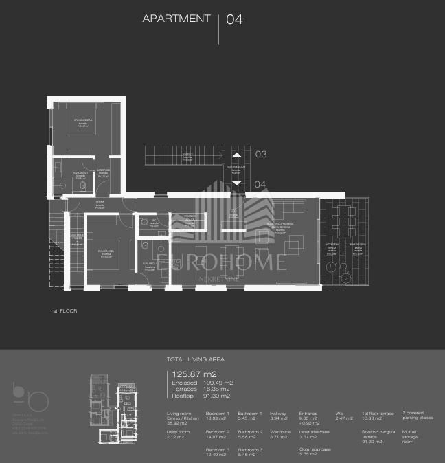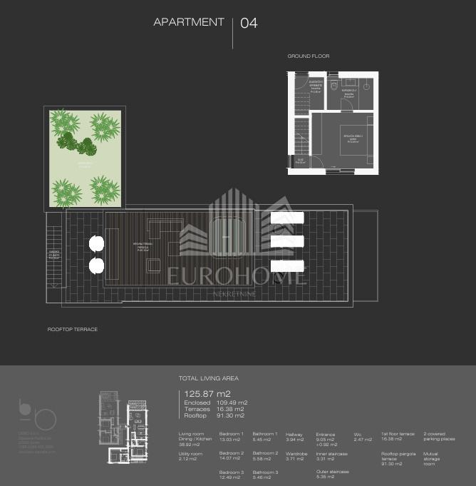 Apartman ima125.87m2 te mu pripada i terasa sa sunčalištem i jacuzzijem, svaka prostorija je klimatizirana a podno grijanje je ugrađeno u kupaonicu i wc a sastoji se od sljedećih prostorija: