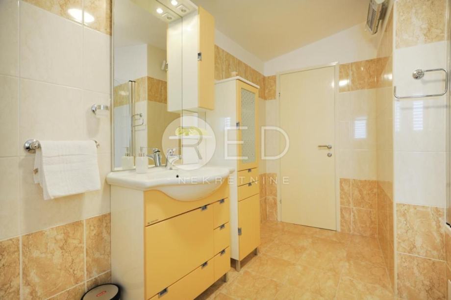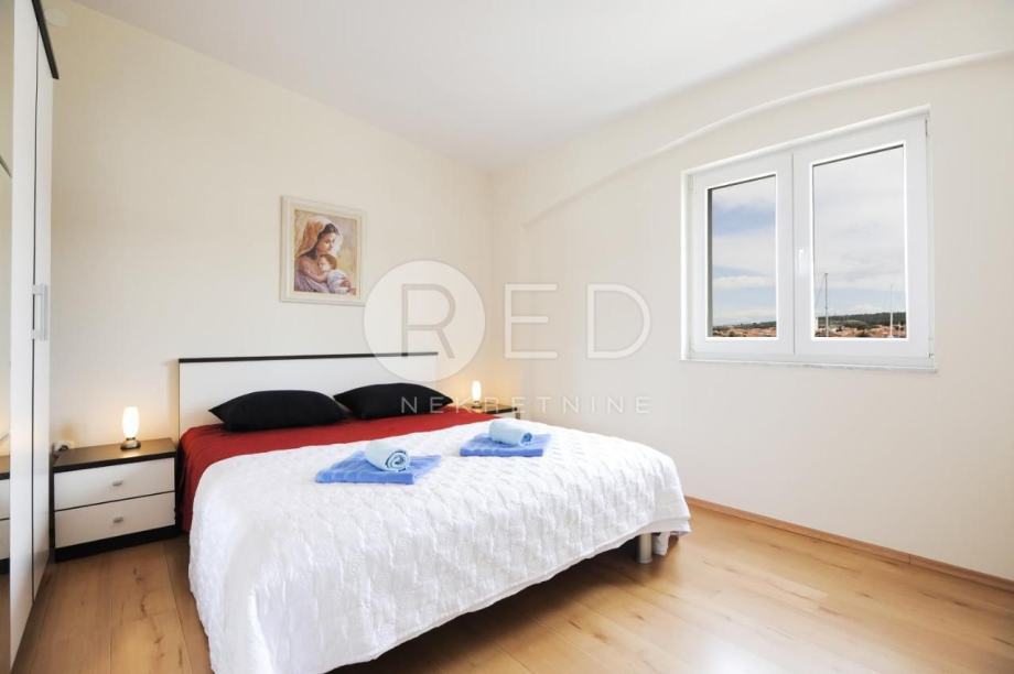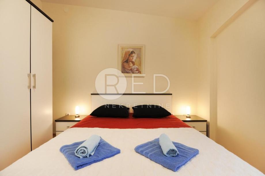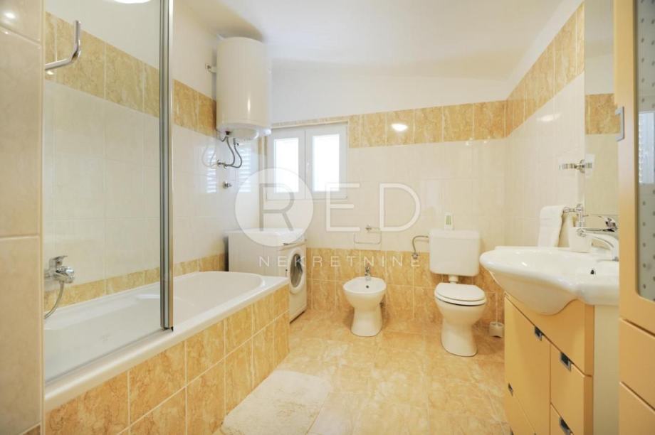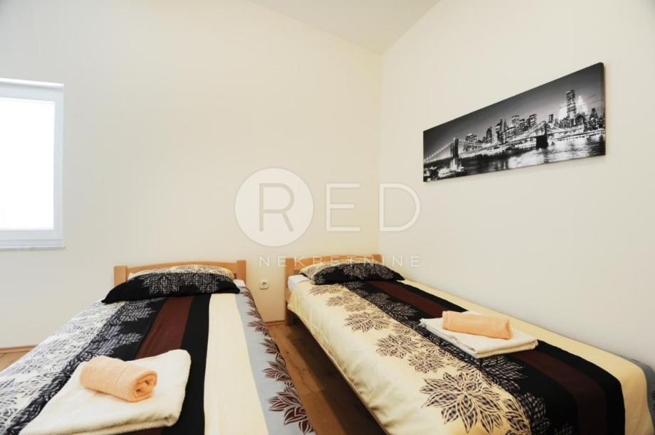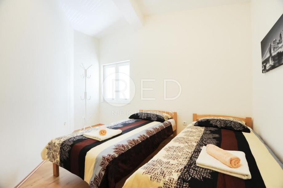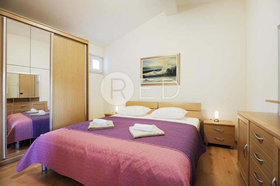 - Apartman na prvom katu se sastoji od kuhinje, dnevnog boravka, hodnika, dvije spavaće sobe, kupaonice i ostave. Posebno se ističe prostrani balkon od 28 m2, s koje se pruža zadivljujući pogled na more. Apartman je kategoriziran s tri zvjezdice i uspješno se koristi u turističke svrhe, ostvarujući izvrsne rezultate.