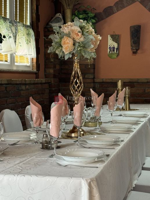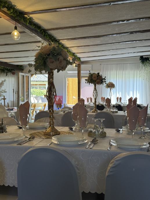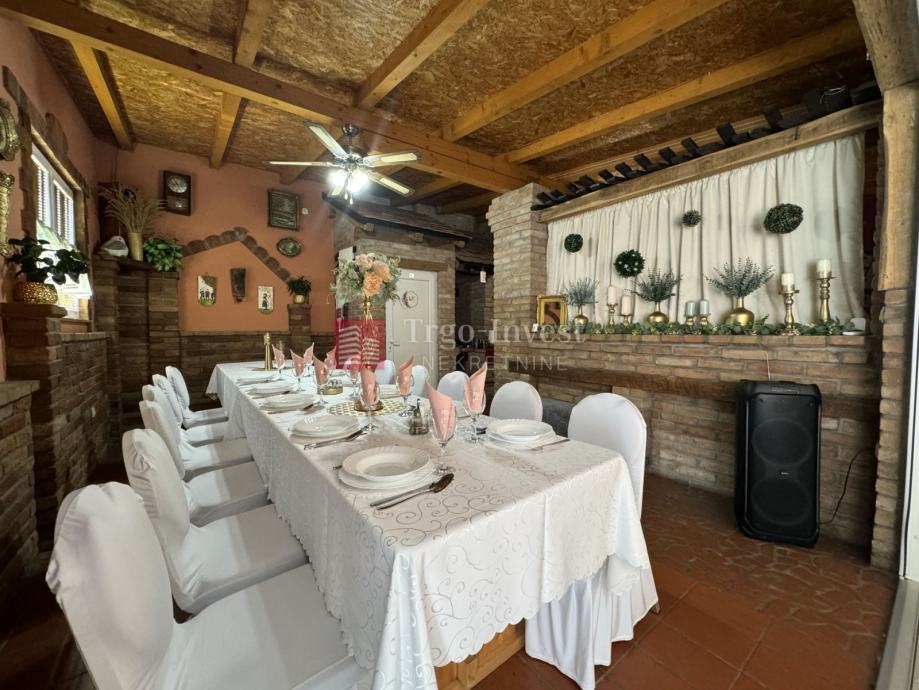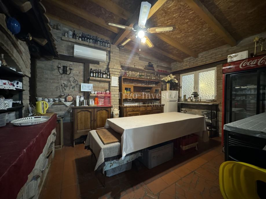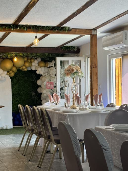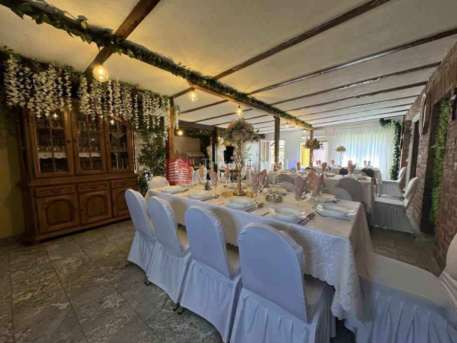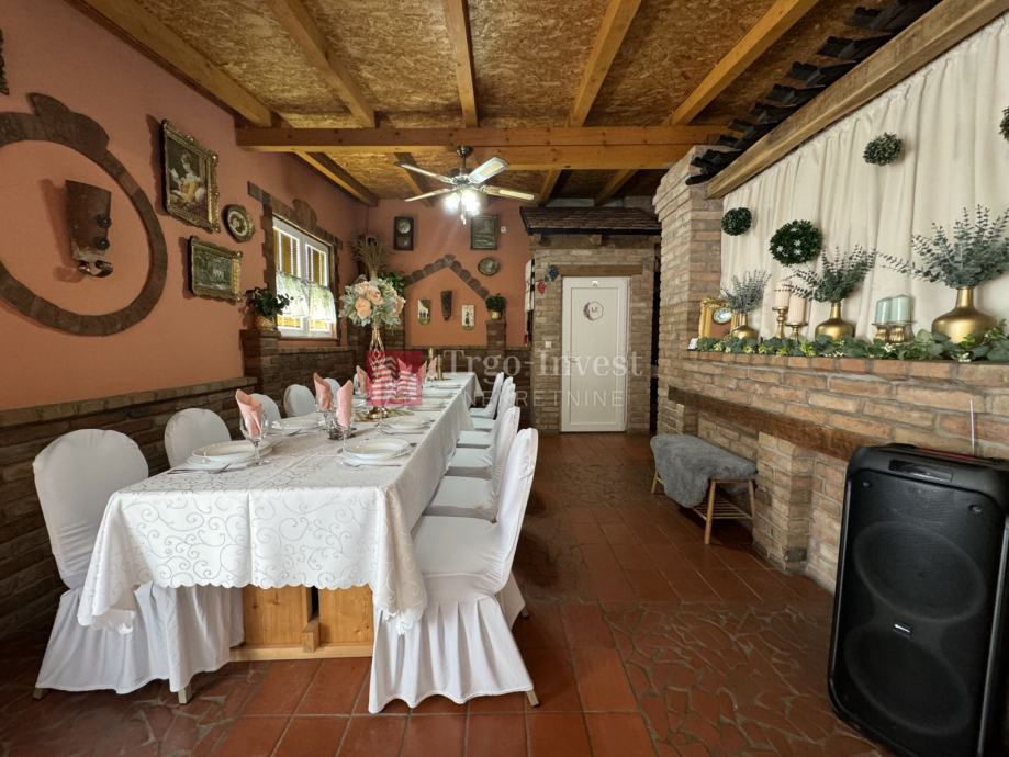 DVORIŠNA ZGRADA sastoji se od velikog otvorenog prostora trenutno uređenog kao prostor za proslave, prostorije s pecarom, dva spremišta, sanitarnog čvora (dvije odvojene WC jedinice m/ž) te natkrivene terase. Objekt je klimatiziran s tri klima uređaja.