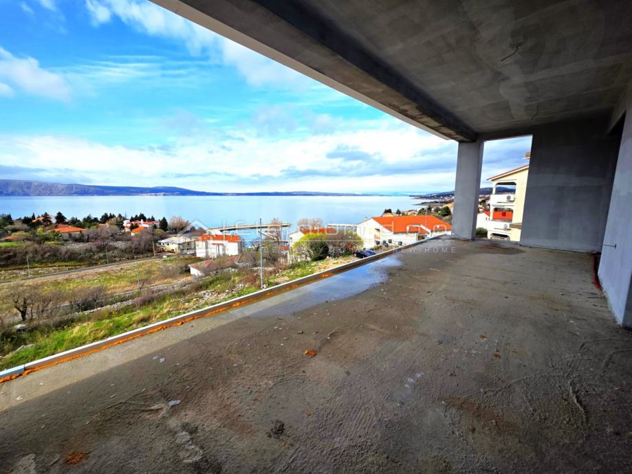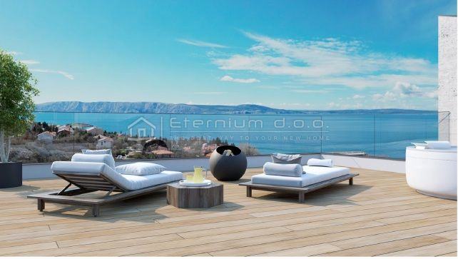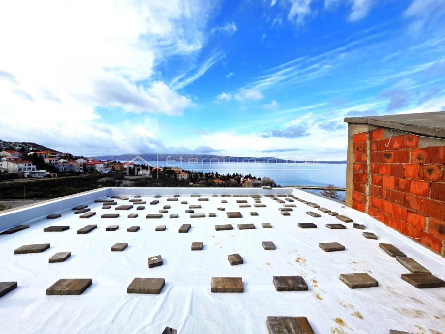 Isti se sastoji od ulaznoga hodnika, tri prostrane spavaće sobe, dvije kupaone (jedna kupaona je zajednička a jedna pripada master bedroom-u) te velikoga open space dnevnoga dijela kojega čine kuhinja sa blagovaonom i dnevni boravak, te natkrivena terasa od 25m2. Iz dnevnoga dijela pruža se prekrasn otvoreni pogled na more. Stepeništem koje se nalazi izvan stana, a odmah pored ulaza, dižemo se na privatnu krovnu terasu koja veličinom zauzima čitavu provršinu stana. Opremljena će biti jacuzziem i modernom pergolom, a sa nje se pruža spekatakularan pogled od kojega zastaje dah, a najbolji je pri zalasku sunca - to treba doživjeti!