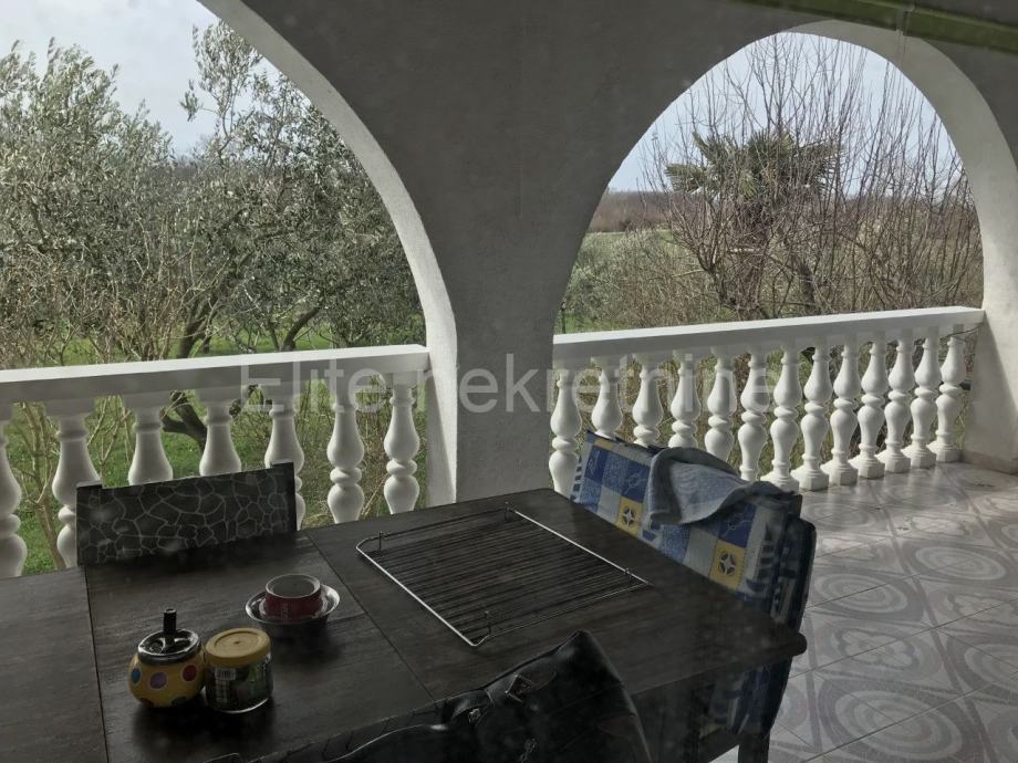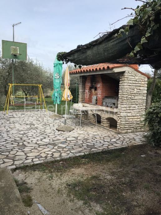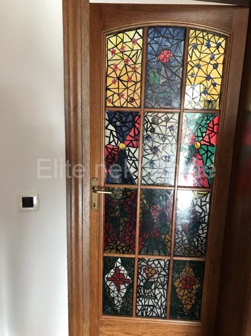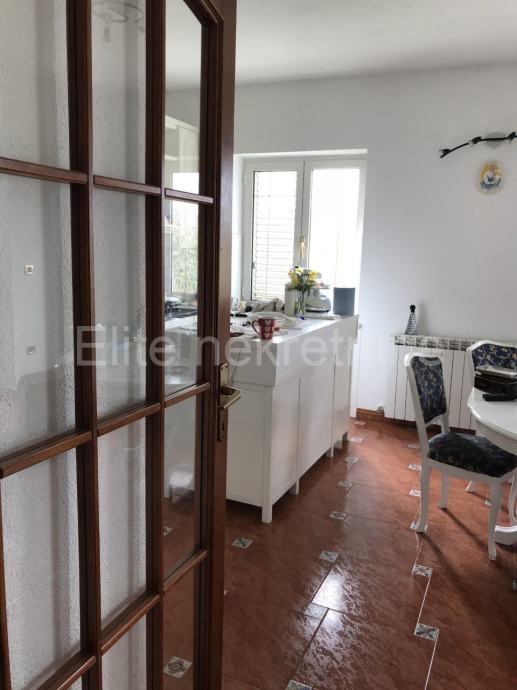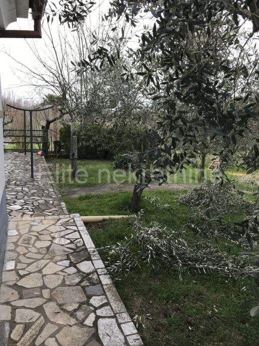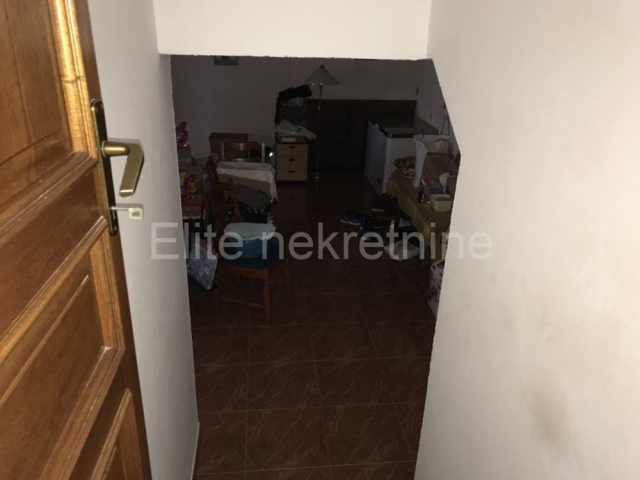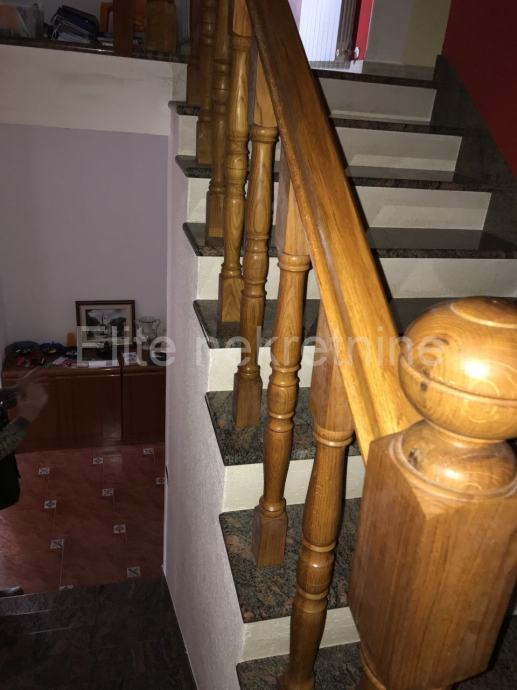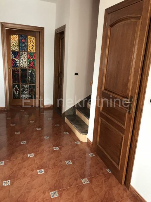 Kuća sa više poluetaža sa ukupno 300 m2 stambene površine, građena u mediteranskom stilu. Tlocrtno je 17x16 m.U prizemlju je kuhinja, dnevni boravak, blagovaonica, sve u jednoj otvorenoj povezanoj prostoriji sa izlazom na natkrivenu terasu, mala ostava i wc. Na polukatu su 3 spavaće sobe sa kupaonciom i hodnikom, na drugom katu je apartman. U podrumu je još nedefinirana prostorija od cca 50 m2. Garaža je posebno sa vanjske strane kuće sa direktnim prilazom sa ceste ograđena okućnica. Vanjska terasa sa roštiljem. Okućnica 800 m2