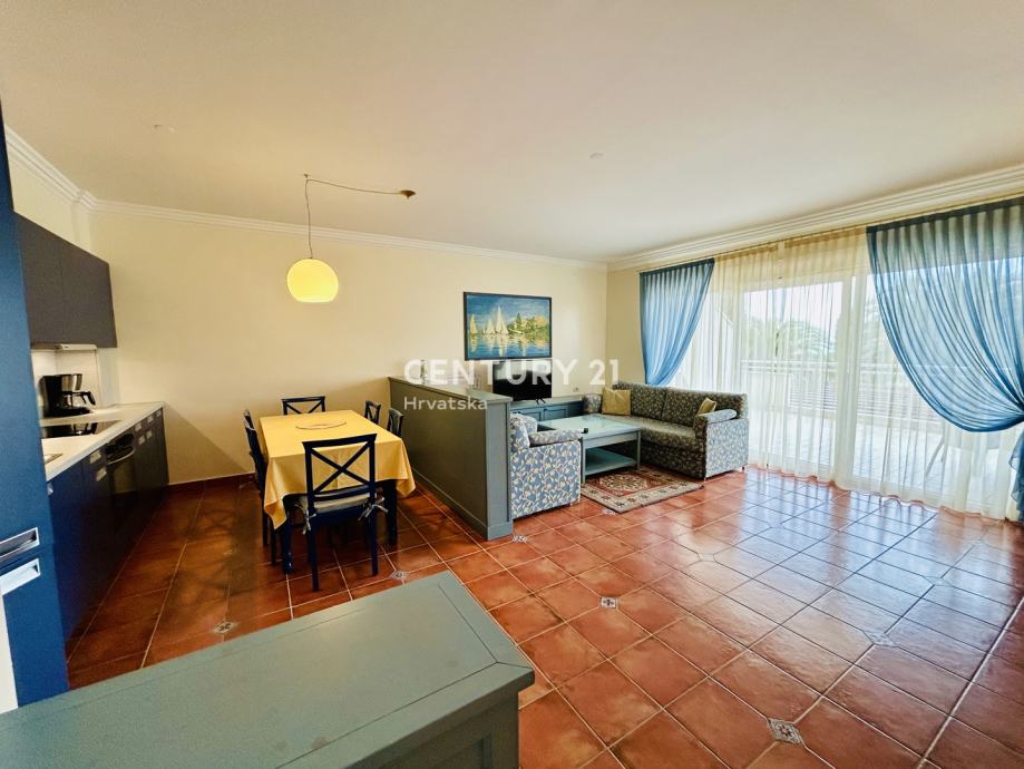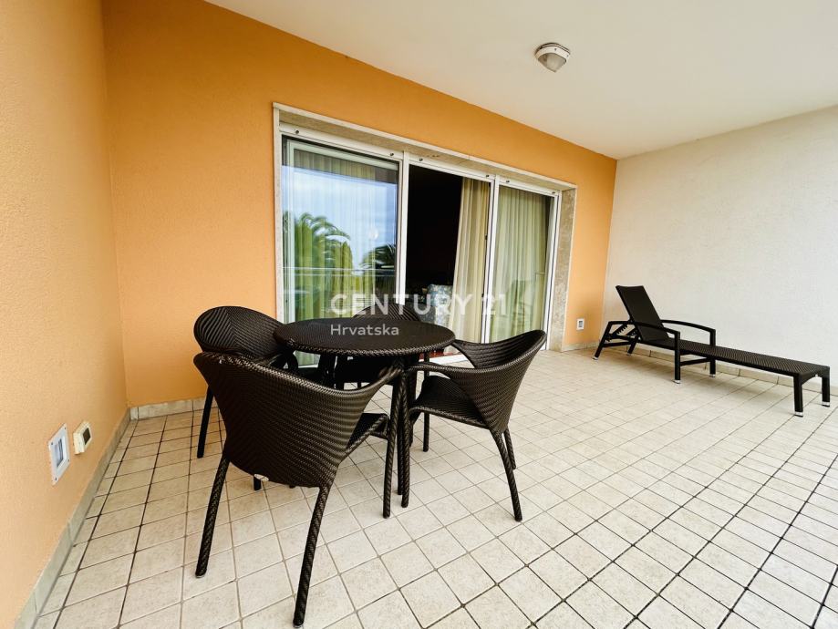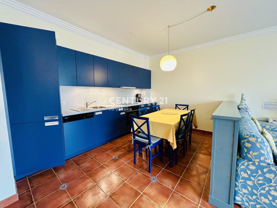 Stan se sastoji od ulaznog hodnika, kuhinje sa dnevnim boravkom i blagavaonom otvorenog tipa, jedne spavaće sobe, kupaonice, wc-a, i prostrane natkrivene terase sa otvorenim pogledom na more. Stan je potpuno opremljen, namješten i u funkciji te se kao takav i prodaje. Stan ima parkirno mjesto, spremište i zgrada je opremljena liftom. Posebna karakteristia ovog stana je prostrani i osunčani balkon površine od 21 m2 koji pruža savršeno mjesto za opuštanje uz pogled na more.