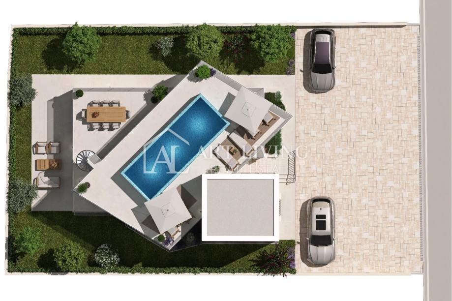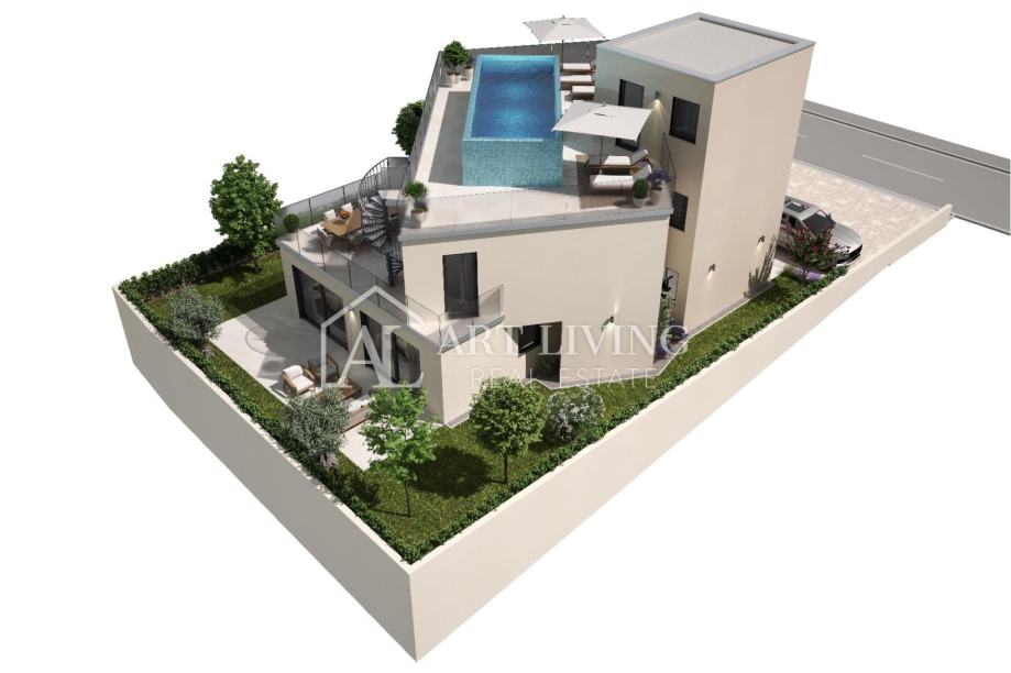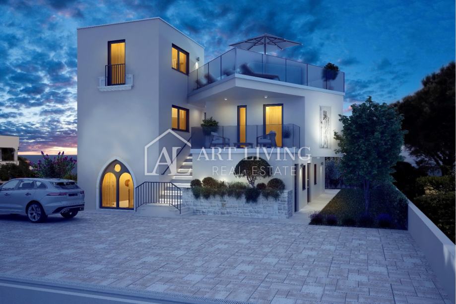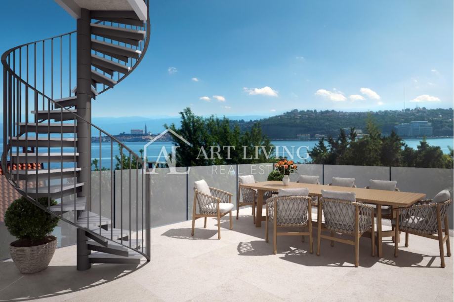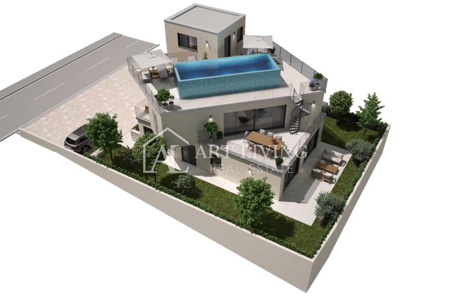 Prodaje se iznimno atraktivno građevinsko zemljište s pogledom na more i Alpe na TOP lokaciji, 100 m od mora i predivne plaže, s gotovim projektom luksuzne moderne vile sa krovnim bazenom.