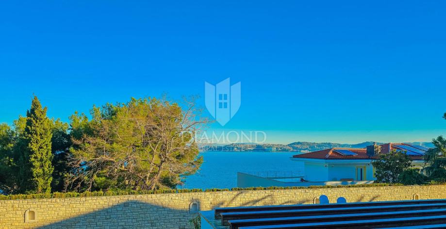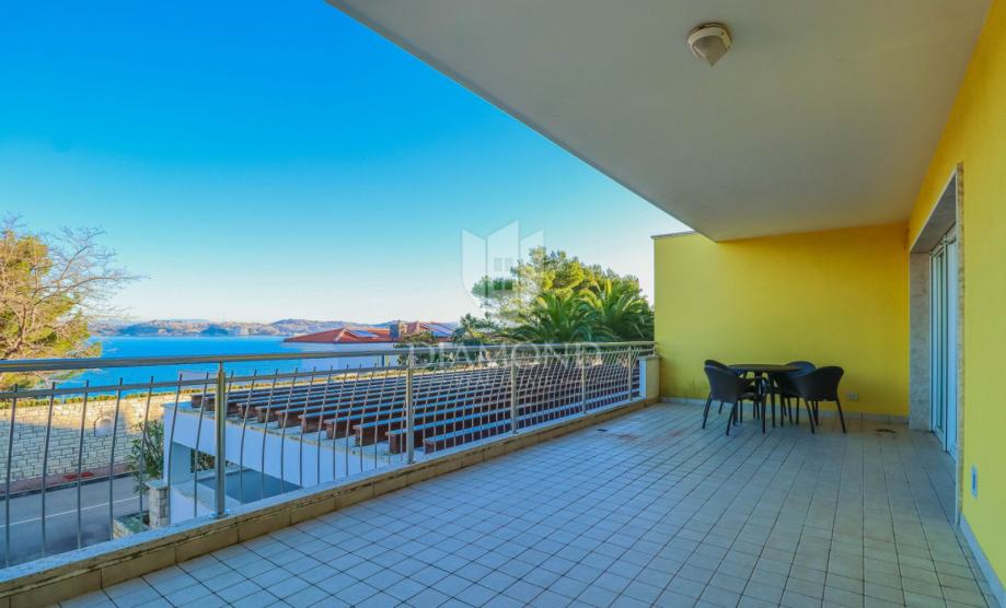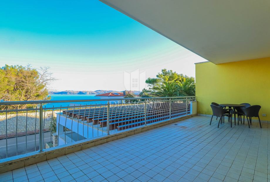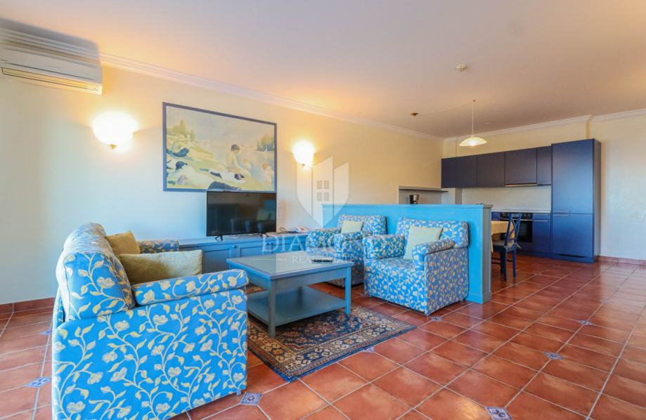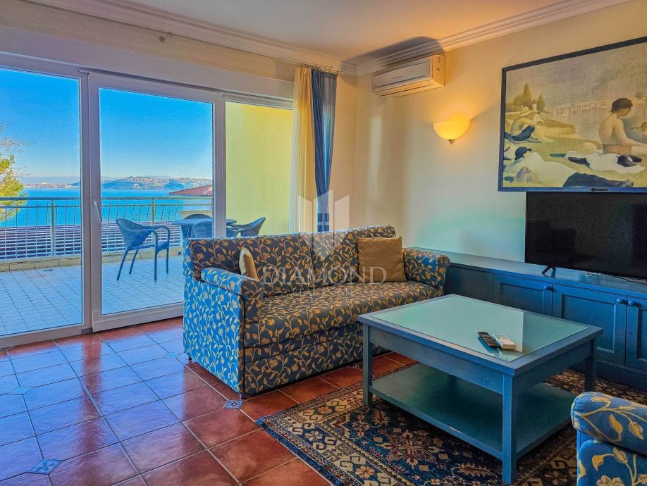 Stan se nalazi u visokom prizemlju stambene zgrade zatvorenog resorta. Ukupna površina stana iznosi 132 m2. Sastoji se od dnevnog boravka sa kuhinjom i blagovaonicom, kupaonice, hodnika i 2 spavaće sobe od kojih je jedna master spavaća soba sa vlastitom kupaonicom. Iz dnevnog boravka se izlazi na prostranu natkrivenu terasu sa koje se proteže prekrasan pogled na more. Stan je u odličnom stanju sa grijanjem i hlađenje je na klima uređaj. Pripada mu spremište u podrumu zgrade. Parking se nalazi ispred zgrade i budući vlasnik može birati želi li natkriveni parking po cijeni od 14.000 eura ili garažu po cijeni od 20.000 eura.