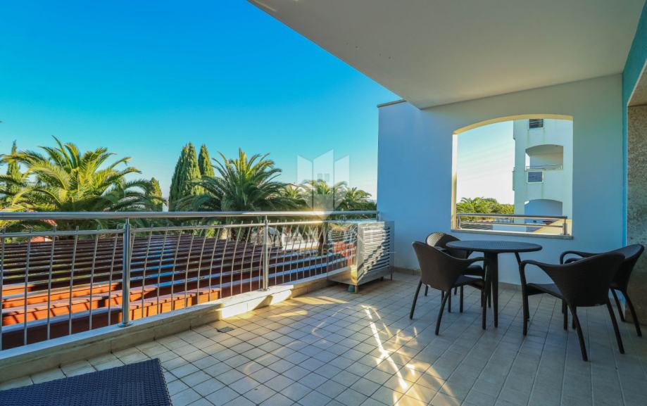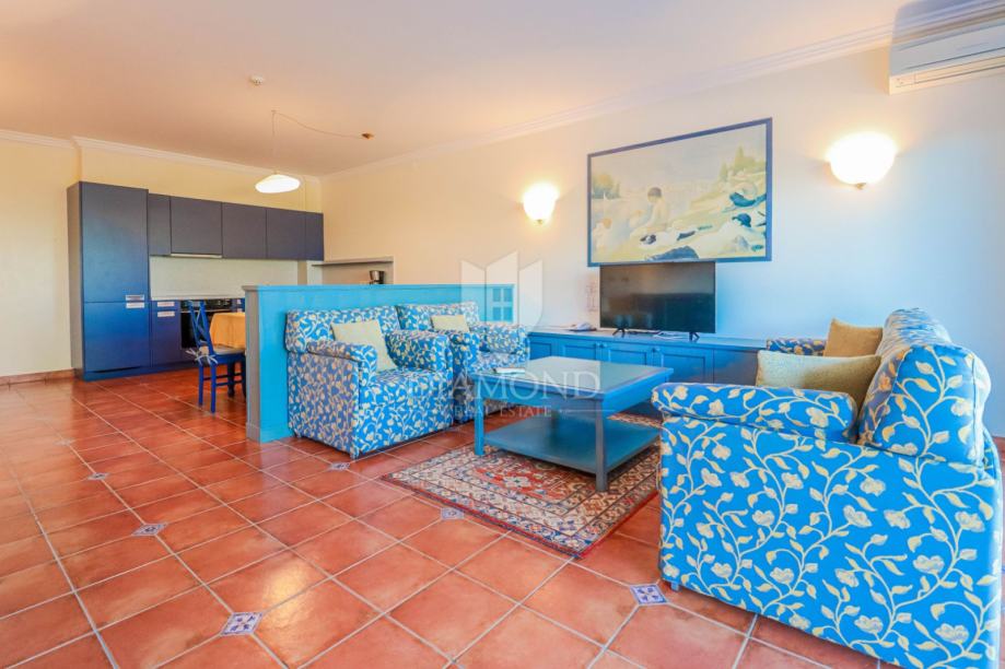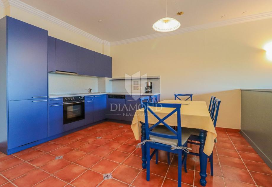 Stan se nalazi u visokom prizemlju stambene zgrade zatvorenog resorta. Ukupna površina stana iznosi 120 m2. Sastoji se od dnevnog boravka sa kuhinjom i blagovaonicom, kupaonice, 2 spavaće sobe od kojih je jedna master spavaća soba sa vlastitom kupaonicom i hodnika. Iz dnevnog boravka se izlazi na prostranu natkrivenu terasu. Stan je u odličnom stanju sa grijanjem i hlađenje je na klima uređaj. Pripada mu spremište u podrumu zgrade. Parking se nalazi ispred zgrade i budući vlasnik može birati želi li natkriveni parking po cijeni od 14.000 eura ili garažu po cijeni od 20.000 eura.