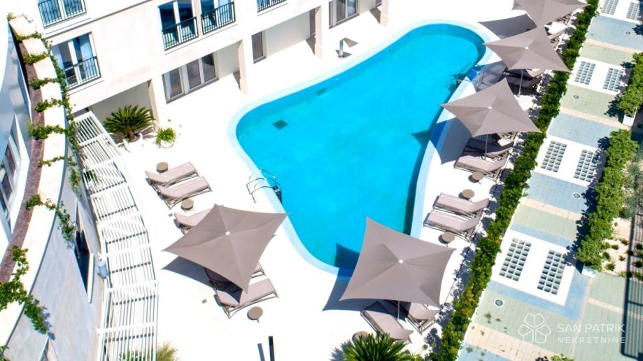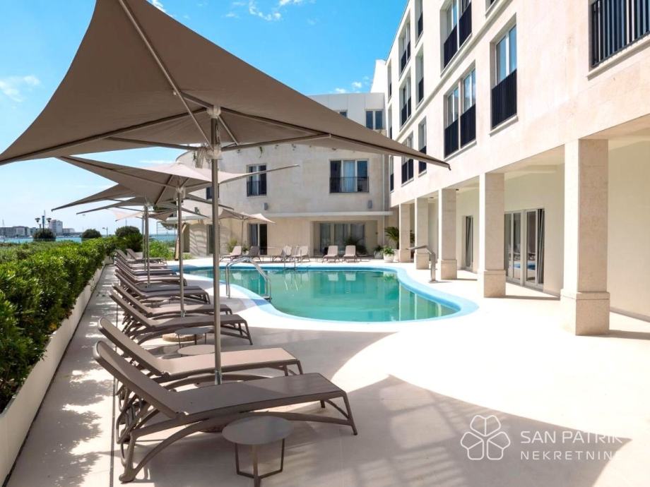 Prodaje se očaravajući apartman s pogledom na more i bazen, smješten u luksuznom resortu u Umagu, prvi red do mora. S ukupno 49 m² stambenog prostora, ovaj moderno namješten apartman nudi prostrani dnevni boravak, kuhinju, kupaonicu i jednu spavaću sobu. Stanu pripada i parkirno mjesto u podzemnoj garaži te suvlasništvo nad bazenom koji se nalazi odmah do zgrade.