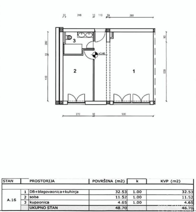 Apartman S-16 – 1. kat – stambena površina 48,70 m2 (1 spavaća soba + 1 kupaonica) + garažno parkirno mjesto; neto obračunska površina 56,20 m2 = 350.000 EUR