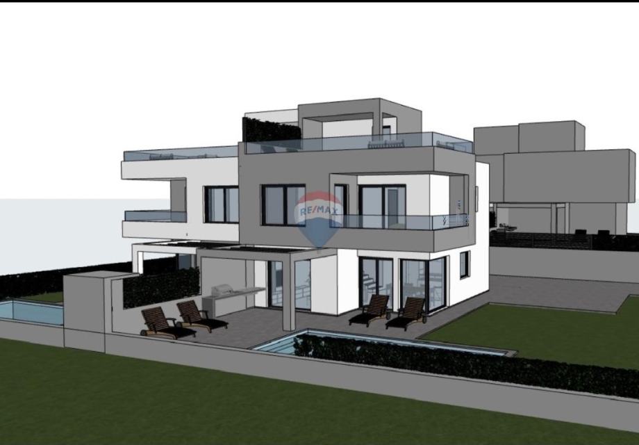 Projekt je napravljen za dvojnu kuću sa dva bazena. Sa parcele se proteže predivan panoramski pogled na more i Dolomite.