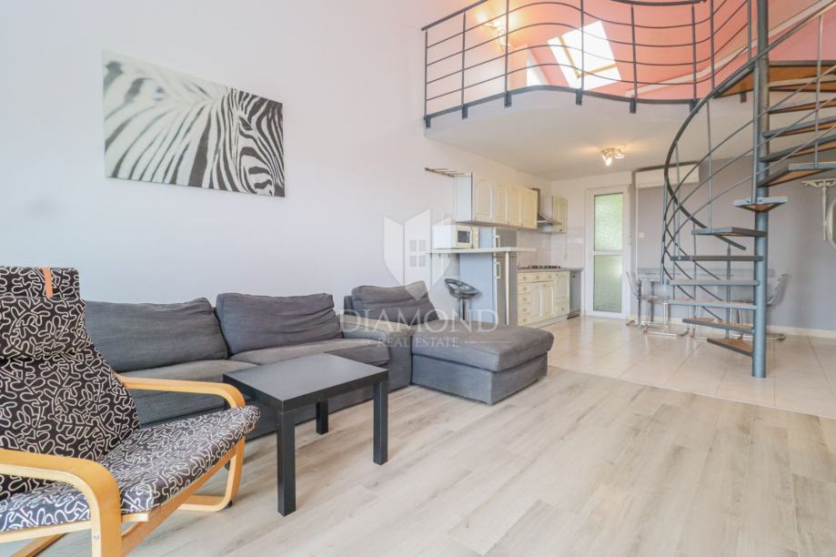 Stan se nalazi na 3. katu stambene zgrade te se sastoji od prostranog dnevnog boravka povezanog s kuhinjom i blagovaonicom, 1 spavaće sobe, kupaonice te galerije koja se može prilagoditi različitim potrebama, kao 2 spavaće sobe ili kombinacija radnog i spavaćeg prostora. Posebnu vrijednost stanu daju 2 terase, od kojih jedna nudi pogled na more, kao i pripadajuće spremište u podrumu zgrade. Grijanje i hlađenje osigurano je putem klima uređaja, dok je parkirno mjesto dostupno za korištenje ispred zgrade.