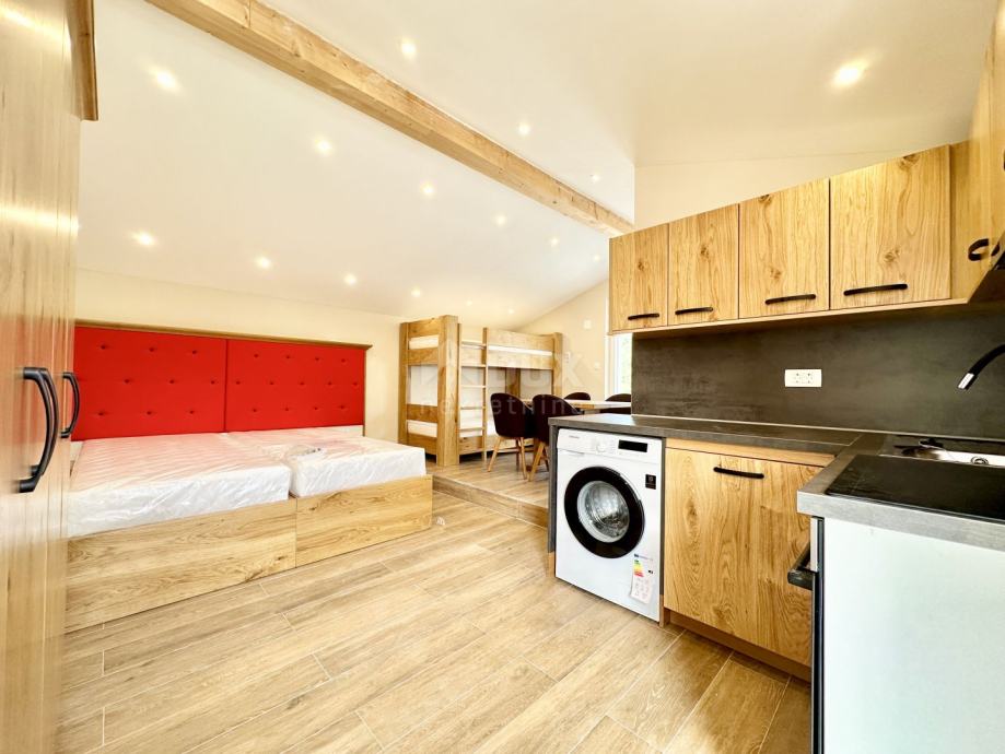 Stan je površine 40 m2 i sastoji se od openspace prostora sa dnevnim boravkom, kuhinjom i blagovaonom, te kupaone za smještaj 4 osobe (bračni krevet + krevet na kat).
