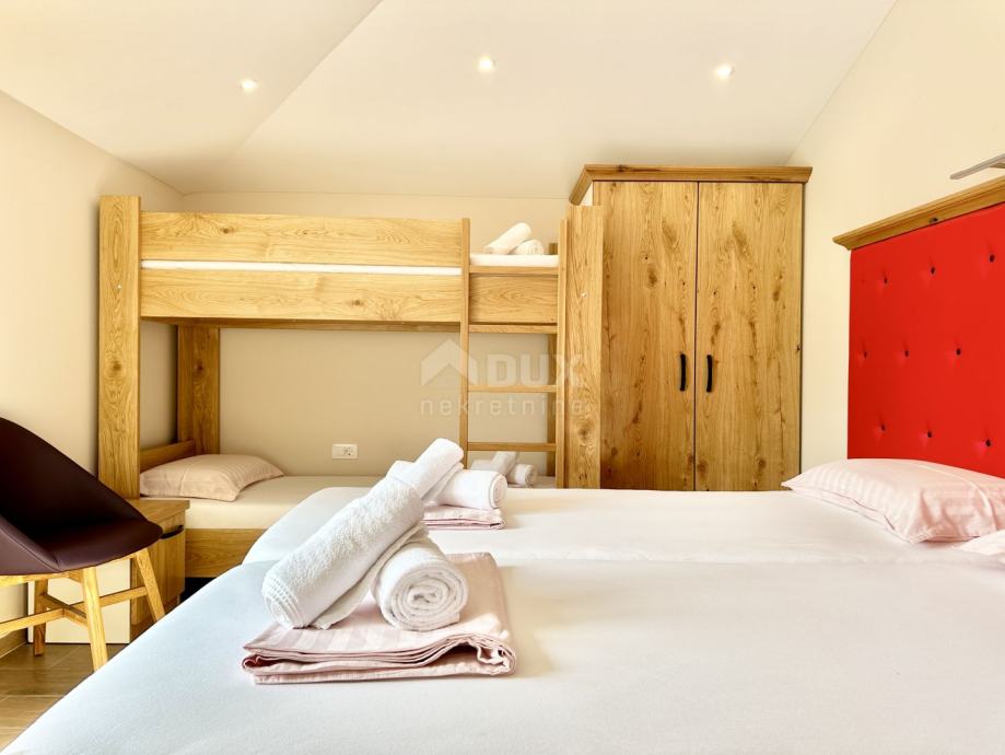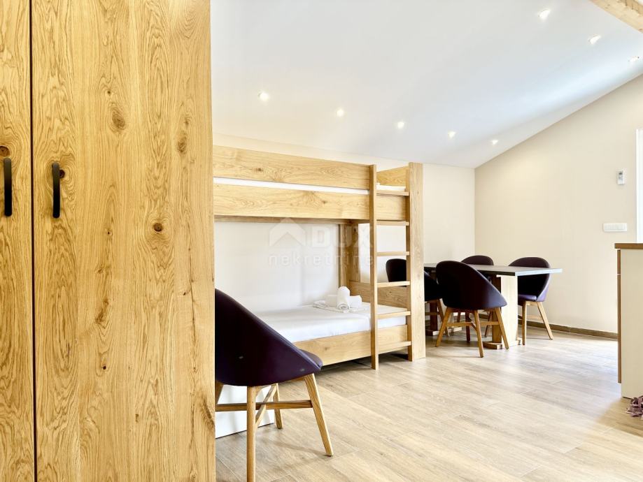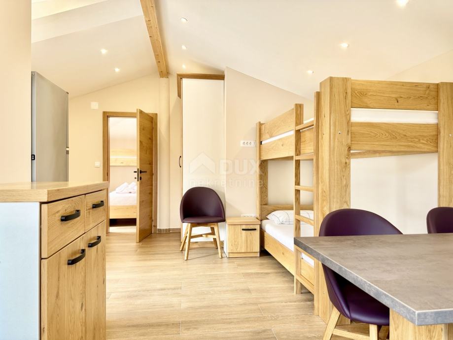 Stan je površine 50 m2 i sastoji se od openspace prostora sa dnevnim boravkom, kuhinjom i blagovaonom, spavaće sobe i kupaone za smještaj 6 osobe (bračni krevet + 2 kreveta na kat).