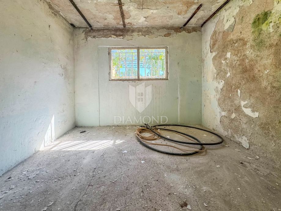 Okućnica nudi dovoljno prostora za bazen, dodatne sadržaje i parkiranje više vozila. Kuća ima priključke za vodu i struju i zahtjeva potpunu renovaciju.