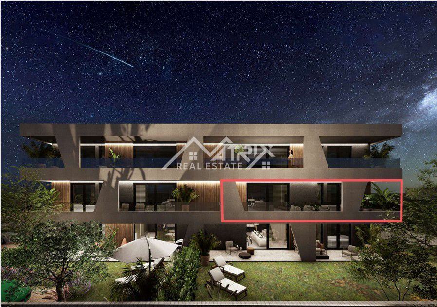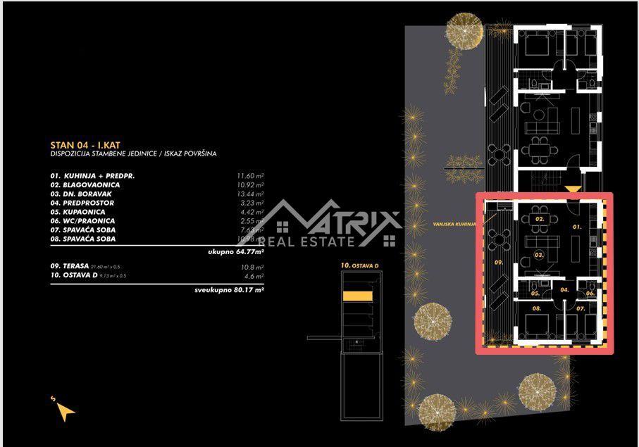Stan se sastoji od prostranog dnevnog boravka povezanog s kuhinjom, dvije spavaće sobe, kupaonice, dodatnog WC-a, velike terase od 22 m² te ostave smještene u podrumu. Uz stan dolazi jedno parkirno mjesto, a postoji mogućnost kupnje dodatnog parkirnog mjesta.