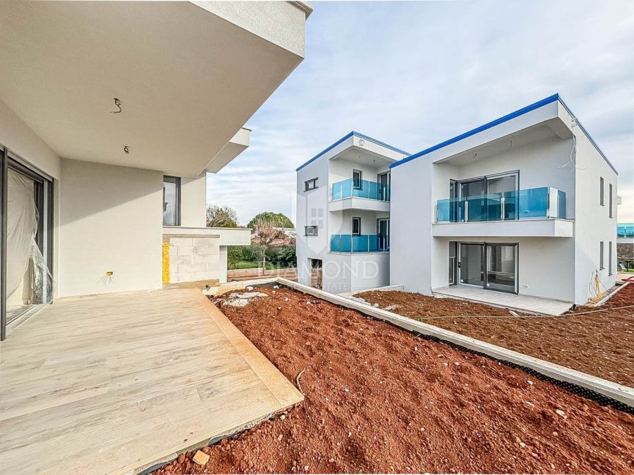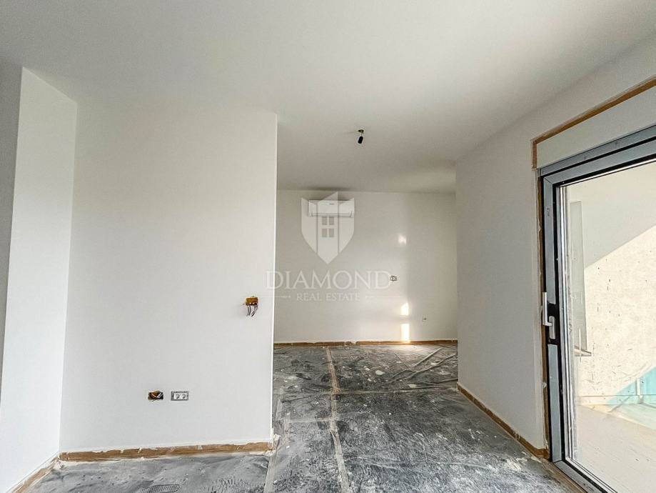 Stan je smješten na prvom katu moderne zgrade sa ukupno 4 jedinice. Ukupna površina stambenog prostora je 70 m2, od čega površina stana iznosi 45 m2. Sastoji se od dnevnog boravka sa kuhinjom i blagovaonicom otvorenog tipa, 2 spavaće sobe i kupaonice. Iz dnevnog boravka se izlazi na natkrivenu terasu s koje se pruža pogled na more i izlaz u ograđeni vrt. Stan je građen s vrhunskim materijalima sa podnim grijanjem u kupaonici, hlađenjem na klima uređaje, aluminijskim prozorima i električnim roletnama s komarnicima. Pripadaju mu dva parkirna mjesta i spremište 5m2.