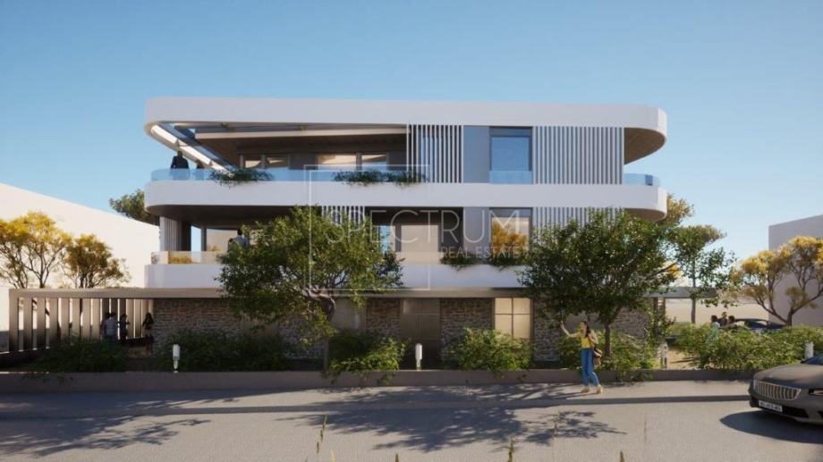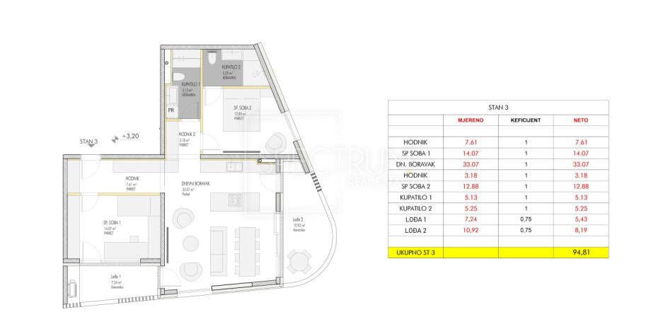 Stan se nalazi na 1.katu novoizgrađene stambene zgrade. Površina stana iznosi 94.81 m2. Stan se sastoji od open space dnevnog boravka sa kuhinjom i blagovaonicom, 2 spavaće sobe, 2 kupaonice, hodnika i 2 loggie. Na jednu loggiu se izlazi iz dnevnog boravka, a na drugu se izlazi iz spavaće sobe i iz dnevnog boravka. Iz stana se pruža pogled na prirodu. Stan se grije putem podnog grijanja na dizalicu topline te klima uređaja. Stan se gradi vrlo kvalitetnim materijalima, od podova, sanitarija, ALU stolarije, protuprovalnih vrata. Zgrada ima i lift te nadzorne kamere. U vlasništvu stana je i parkirno mjesto sa električnim priključkom za punjenje električnih vozila.