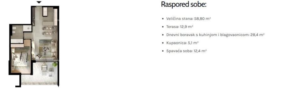 Stan S32, ukupne površine 58,80 m², nalazi se na 1.katu zgrade i sastoji se od: