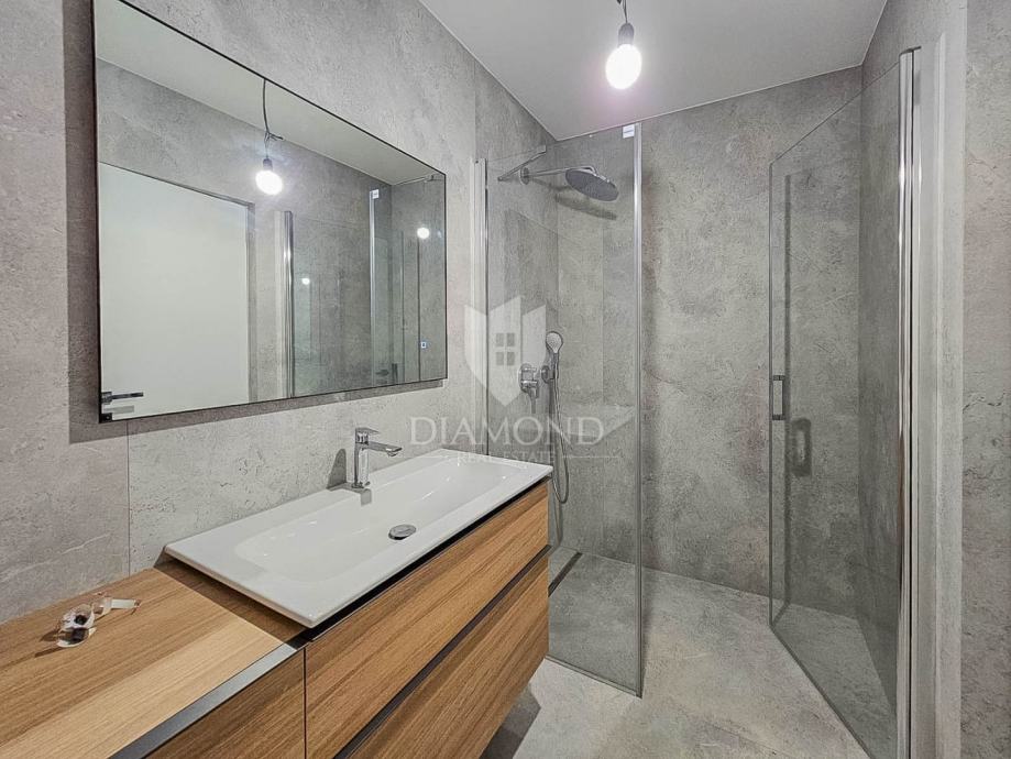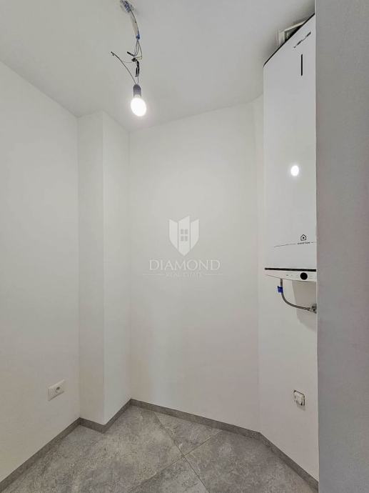Stan je smješten na 2. katu nove moderne zgrade sa liftom. Ukupna površina stana iznosi 98 m2. Sastoji se od dnevnog boravka sa kuhinjom i blagovaonicom otvorenog tipa, 2 spavaće sobe, kupaonice i spremišta. Iz dnevnog boravka se izlazi na terasu sa pogledom na more. U neposrednoj blizini nalazi se gradski parking a po želji postoji i mogućnost kupnje vlastite garaže po cijeni od 31.250 eura koja se nalazi u podrumu zgrade.