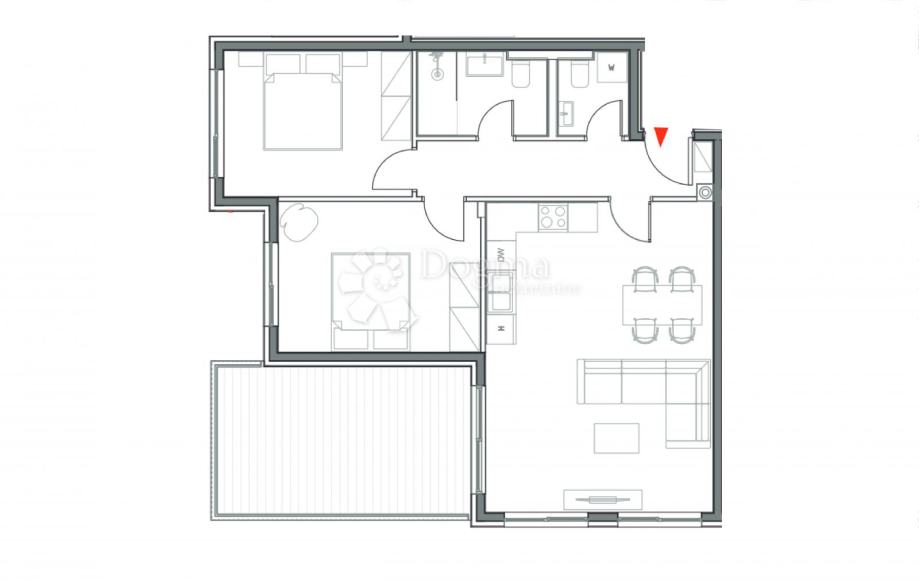 Sastoji se od ulaznog prostora, 2 spavaće sobe, 2 kupaone te prostranog dnevnog boravka s kuhinjom i blagovaonom.