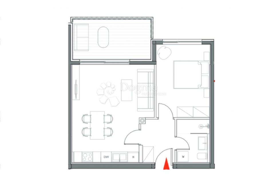 Sastoji se od ulaznog prostora, 1 spavaće sobe, kupaone te prostranog dnevnog boravka s kuhinjom i blagovaonom.