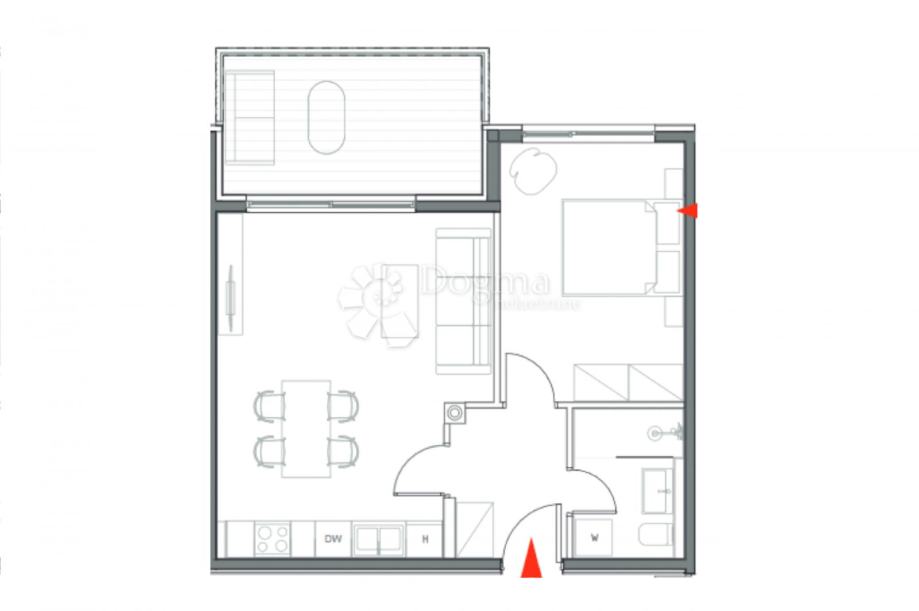 Sastoji se od ulaznog prostora, 1 spavaće sobe, kupaone te prostranog dnevnog boravka s kuhinjom i blagovaonom.