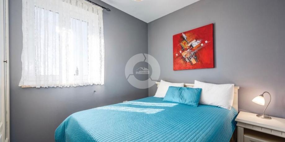 Dvojna kuća nalazi se na mirnom mjestu nedaleko od Umaga, svega 350 m od uređenih plaža. Sagrađena je 2008. godine. Sastoji se od podruma, prizemlja i prvog kata. U podrumu se nalazi samo garaža od 32,50 m2. U prizemlju se nalazi hodnik, dnevni boravak, blagovaona, kuhinja, kapaonica i dvije terase (jedna na istočnoj strani gdje se nalazi bazen i na koju se izlazi iz dnevnog boravka, dok je druga na zapadnoj strani na koju se izlazi iz kuhinje i blagovaone). Unutranjim se stepenicam odlazi na kat gdje se nalaze tri spavaće sobe i kupatilo. Grjianje je regulirano putem klima urađaja. U vrtu se nalazi bazen dimenzije 7 x 3,5 m, te uređena i ograđena okućnica. Lokacija je idealna za one koji traže lokacije vrlo blizu uređenih plaža koje su dostupne bez upotrebe automobila.