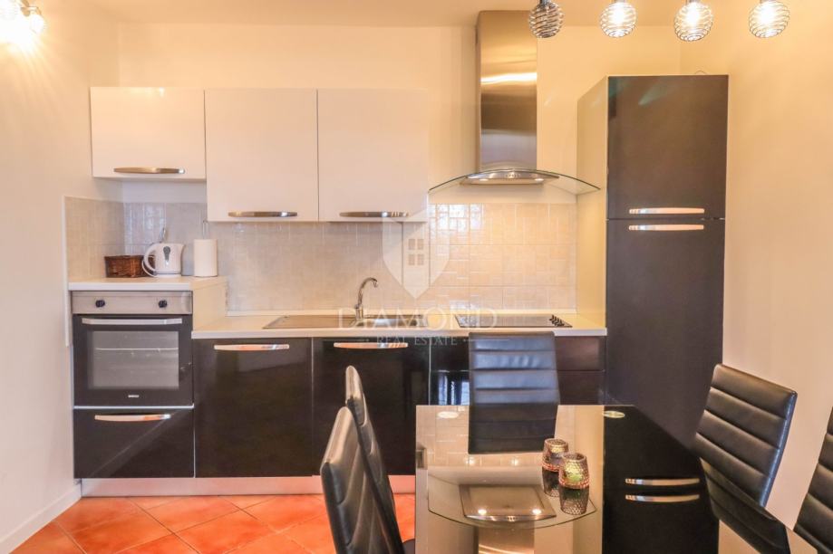 Stan je smješten na 1. katu stambene zgrade udaljene svega 200m od plaže. Ukupna površina stambenog prostora iznosi 66 m2. Stan se sastoji od prostranog dnevnog boravka, kuhinje, kupaonice, hodnika, 2 spavaće sobe od koje jedna pruža pogled na more. Iz dnevnog boravka se izlazi na natkriven balkon sa kojeg se pruža pogled na more. Stan je vrlo prostran i osvijetljen, moderno opremljen te spreman za useljenje. Stan se grije pomoću klima uređaja te mu pripada označeno garažno mjesto od 12,4 m2.