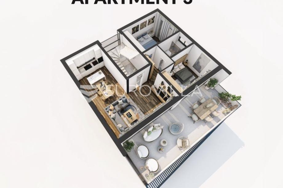 Ovaj prostrani stan sastoji se od kuhinje i blagovaonice, ugodnog dnevnog boravka, dvije spavaće sobe, jedne kupaonice i terase.