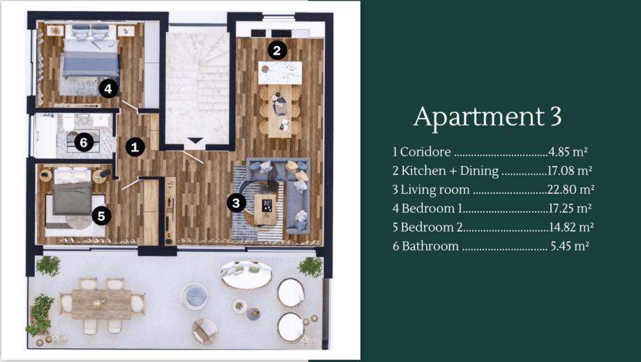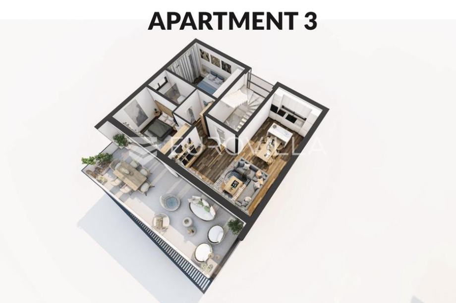 Prostrana terasa ovog stana površine 42.53 m2, pruža idealno okruženje za opuštanje i druženje s obitelji i prijateljima. Ugodna atmosfera mira i spokoja čine ovaj prostor savršenim za stvaranje nezaboravnih trenutaka i uživanja u ljepotama prirode.