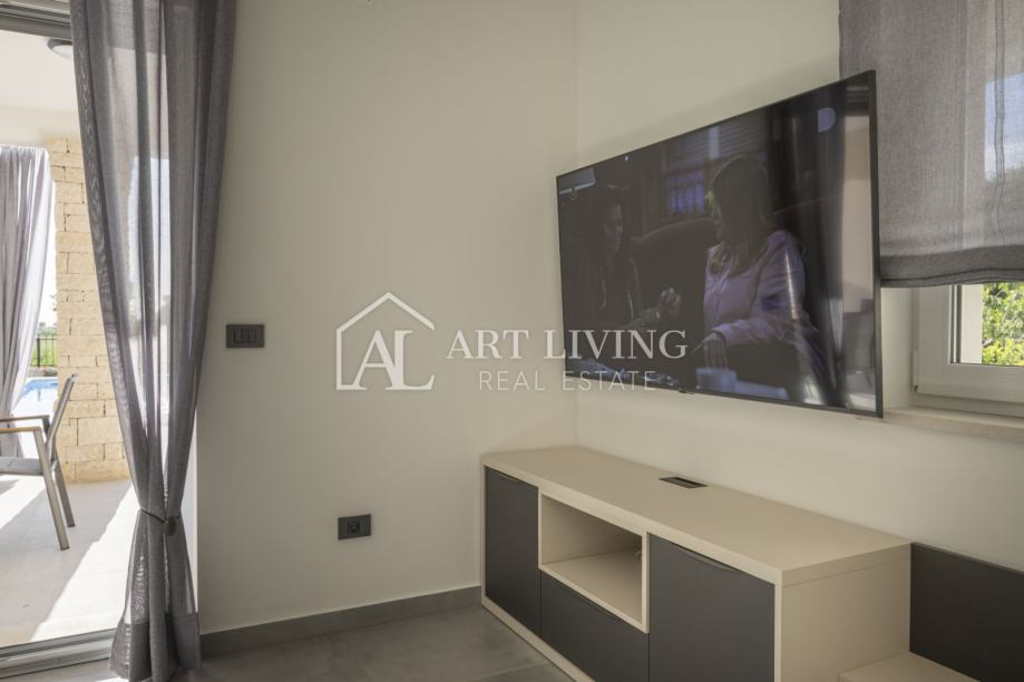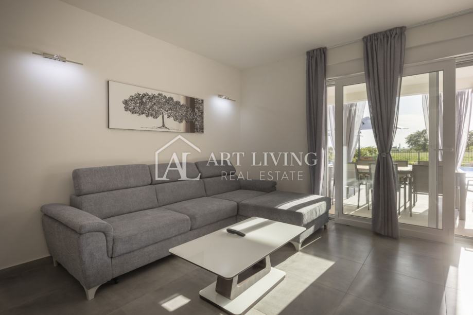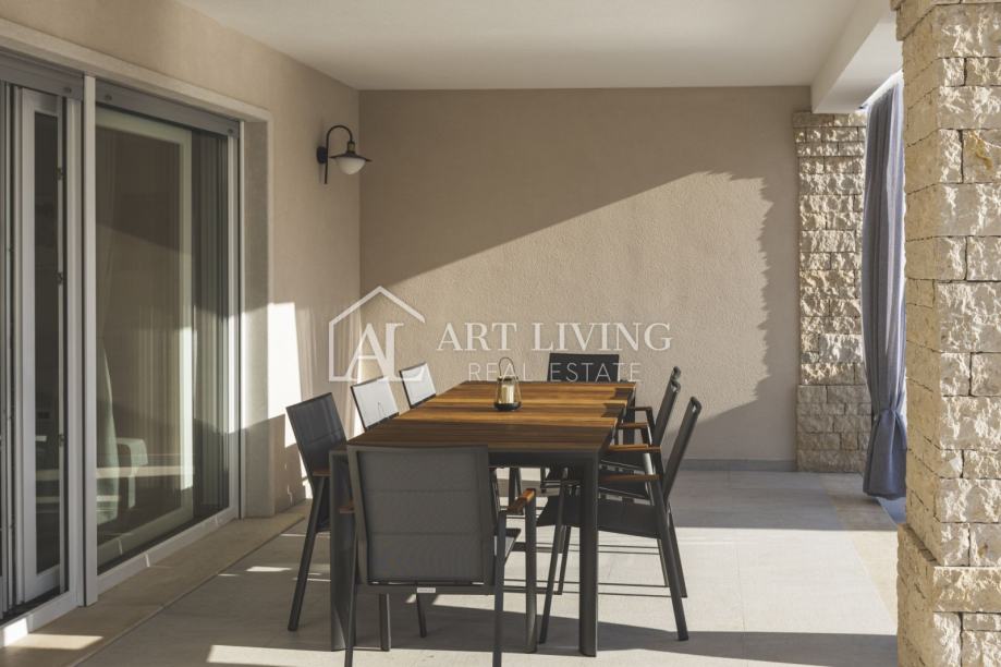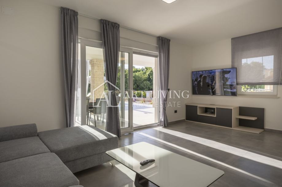 Iz dnevnog boravka i kuhinje pristupa se direktno na natkrivenu terasu, bazen i dvorište .