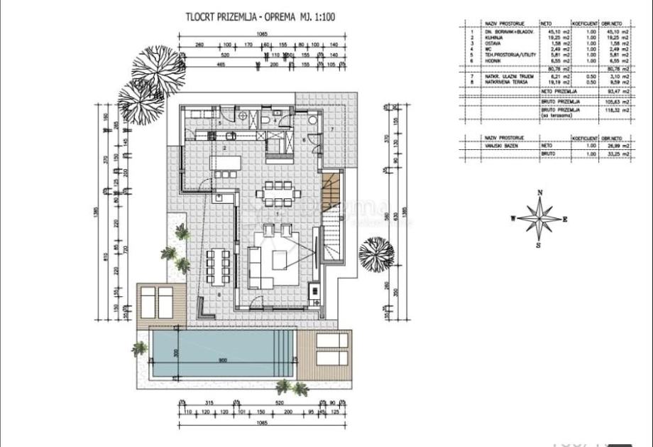 Dvorište vile nudi bazen od 27 m² sa sunčalištem, idealno za uživanje tijekom toplih ljetnih dana. Vila se prodaje po principu "ključ u ruke", što znači da će biti potpuno završena (bez namještaja), omogućujući vam da interijer uredite prema vlastitim željama. Osigurana su dva parkirna mjesta, čime je omogućena dodatna udobnost.
