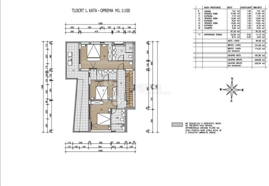 Na prvom katu vile smještene su tri prostrane spavaće sobe, svaka s vlastitom luksuznom kupaonicom, što jamči maksimalnu udobnost i privatnost za sve članove obitelji. S prvog kata također se izlazi na natkrivenu terasu koja pruža dodatni prostor za opuštanje i uživanje u mirnom okruženju.