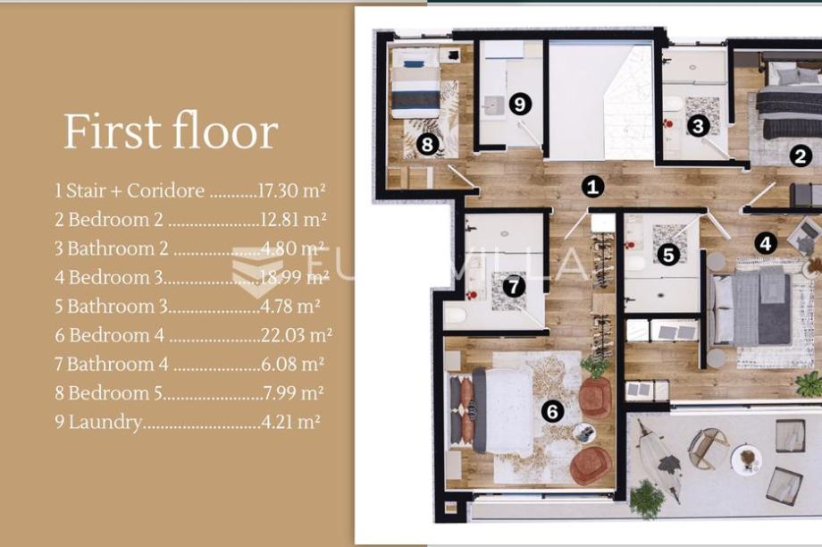 S 232.91 m2 unutarnjeg prostora, ova vila nudi prostran dnevni boravak, prostranu kuhinju s blagovaonicom, pet raskošnih spavaćih soba, četiri kupaonice, jedan toalet i spremište i vešeraj.