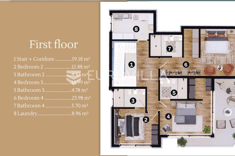 S 232.91 m2 unutarnjeg prostora, ova vila nudi prostran dnevni boravak, prostranu kuhinju s blagovaonicom, pet raskošnih spavaćih soba, četiri kupaonice, jedan toalet i spremište i vešeraj.