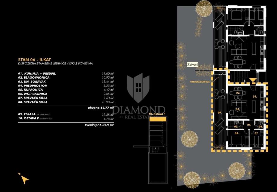 Stan je smješten na 2. katu moderne zgrade sa ukupno 6 stanova. Ukupna površina stana iznosi 82.90 m2. Sastoji se od dnevnog boravka sa kuhinjom i blagovaonicom otvorenog tipa, 2 spavaće sobe, kupaonice, wc-a za goste i hodnika. Iz dnevnog boravka se izlazi na veliku terasu površine 26 m2. Stanu pripada 1 parkirno mjesto uz mogućnost nadoplate za drugo, te ostava u podrumu zgrade.