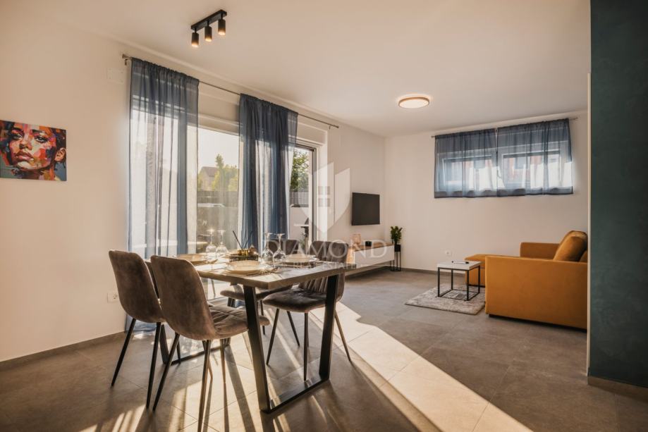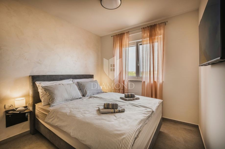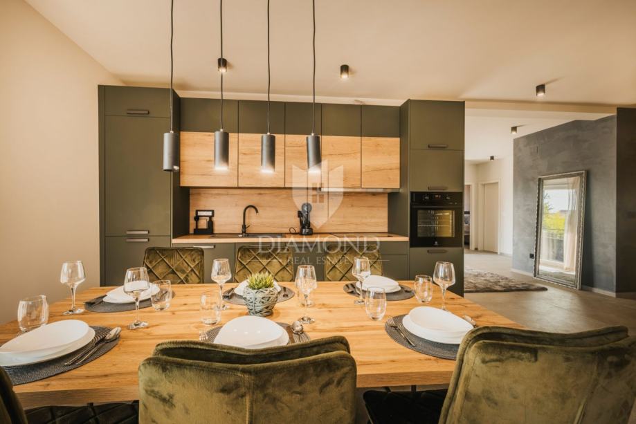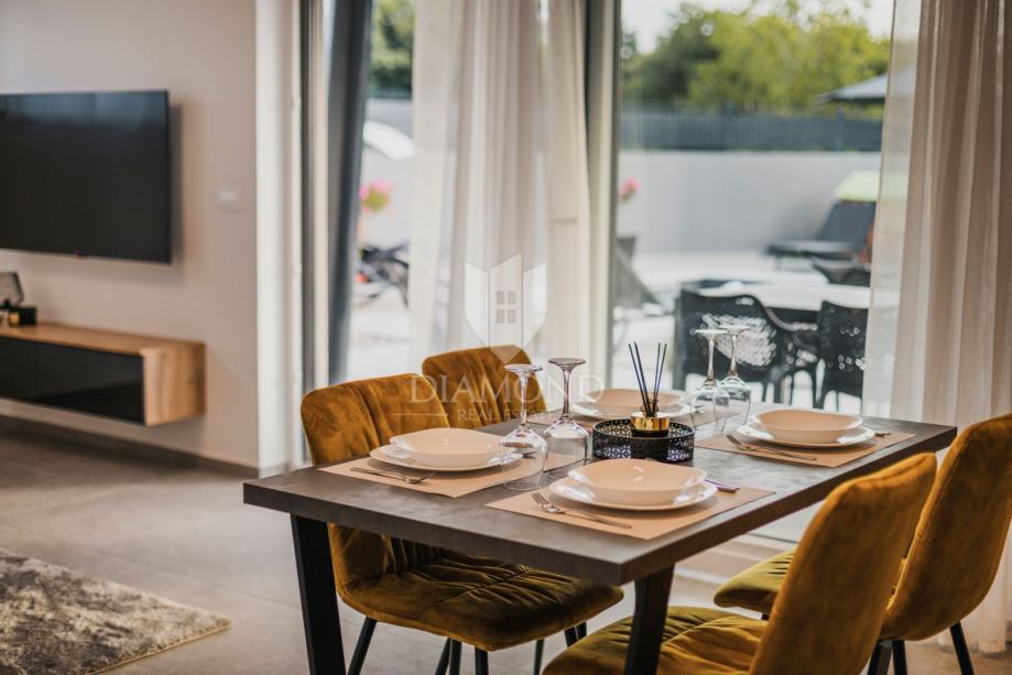 Vila je smještena na zemljištu površine 862 m2 a ukupna površina ove vile iznosi 266 m2. Ova prekrasna vila proteže se na dvije etaže. U prizemlju su smještena dva stana s izlazom na uređenu okućnicu na kojoj je smješten bazen. Stanovi u prizemlju sastoje se od open space dnevnog boravka s kuhinjom i blagovaonicom, kupaonice, 1 prostrane spavaće sobe te terase s pogledom na bazen i vrt. Stanovi u prizemlju imaju 46 m2 i 65 m2, sa podnim grijanjem na struju u kupaonicama i inverter klima uređajima. Na kat se pristupa unutarnjim stepenicama na kojem je smješten treći veliki stan površine 126 m2. Sastoji se velikog dnevnog boravka s kuhinjom i blagovaonicom, 3 spavaće sobe, i radne spbe koja se može višenamjenski iskoristiti a trenutno služi kao teretana. Uz to stan sadrži i 2 kupaonice, wc za goste i spremište. Iz dnevnog boravka izlazi se na terasu sa koje se proteže pogled na zelenilo i bazen. Grijanje ovog stana je na toplinsku pumpu, a hlađenje na klima uređaje.