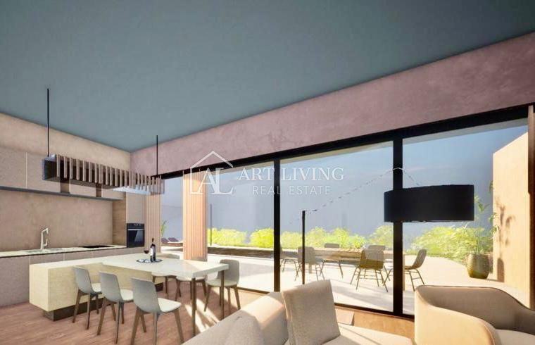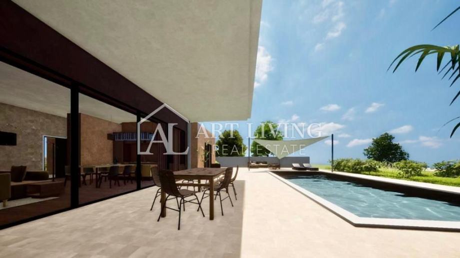 Umag-okolica, projekt moderne vile s bazenom, ravnim krovom i krovnom (prodaja)