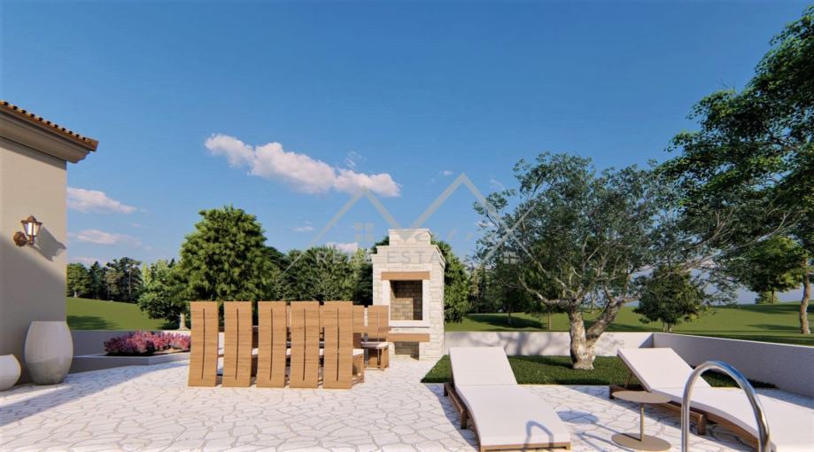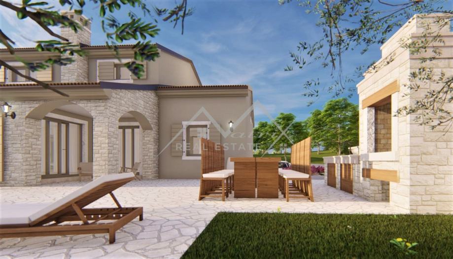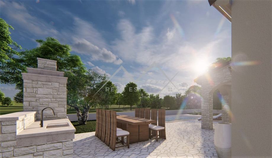 Centralni dio prekrasne ograđene okućnice je veliki bazen sa sunčalištem, a pored njega se nalazi ljetna kuhinja, idealna za druženje i uživanje tijekom toplih ljetnih mjeseci. U sklopu okućnice nalazi se i parking za najmanje dva vozila.