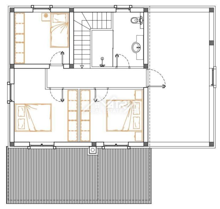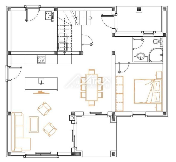 Kuća se proteže na prizemlje i kat, ukupne stambene površine 161 m2. Prizemlje kuće zamišljeno je kao otvoren prostor koji ujedinjuje dnevni boravak s blagovaonicom i kuhinjom, spavaća soba, kupaonica, hodnik, spremište i tehnička soba. Iz dnevnog boravka izlazi se na terasu bazena kroz velike staklene stijene. Unutarnjim stepenicama odlazi se na prvi kat na kojem se nalaze 3 spavaće sobe, kupaonica i hodnik.