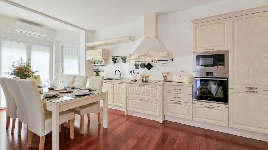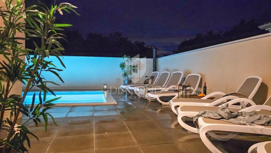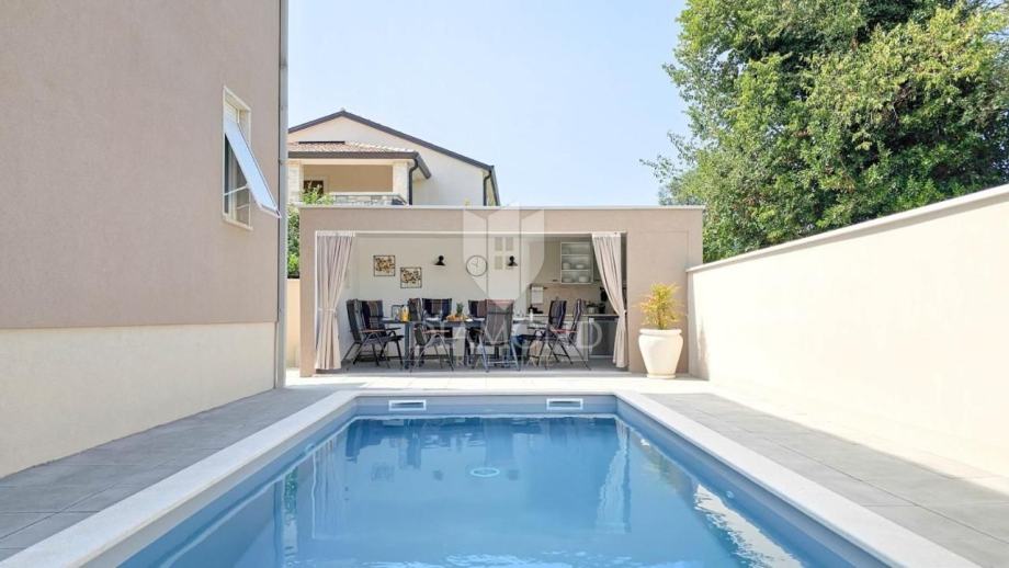Nekretnina se sastoji od šest soba, uključujući četiri spavaće sobe, tri kupaonice i dodatni WC. Prostrani dnevni boravak i kuhinja s blagovaonicom otvorenog su koncepta, s direktnim izlazom na terasu i bazen, omogućujući uživanje u vanjskom prostoru. U prizemlju se također nalazi spremište, dok su spavaće sobe smještene na katu, svaka Kuća je opremljena klima uređajima u svim prostorijama, sigurnosnim sustavom s video nadzorom i alarmom, pružajući maksimalnu udobnost i sigurnost. Privatni bazen okružen je uređenom okućnicom, idealnom za opuštanje i uživanje u toplim ljetnim danima.