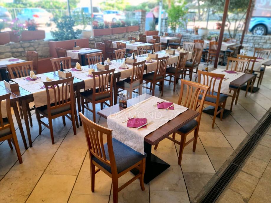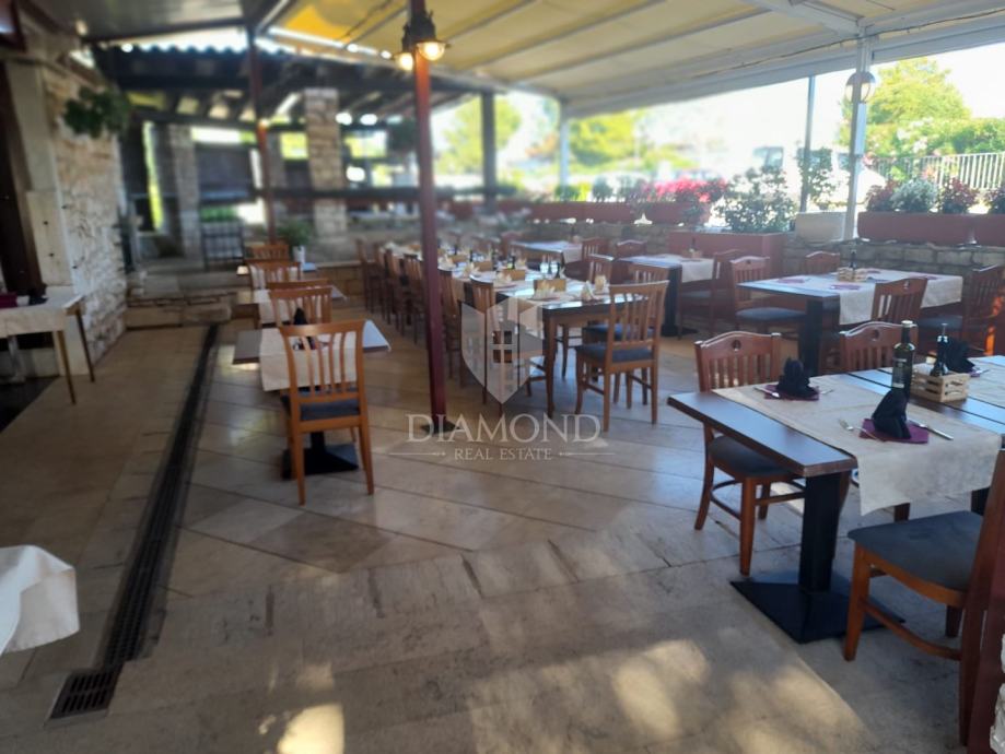 Restoran se odlikuje prostranim interijerom sa velikim kaminom, opremljenom kuhinjom i šankom, a uz objekt je i vanjska terasa za dodatna sjedeća mjesta. Atraktivna lokacija u prestižnom dijelu Umaga, blizina plaže i šetnice, te stalni promet gostiju čine ga idealnim za restoran, konobu, lounge bar ili bistro.