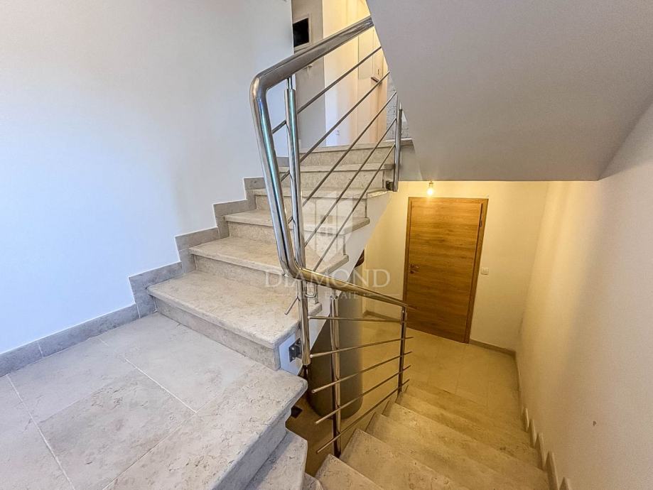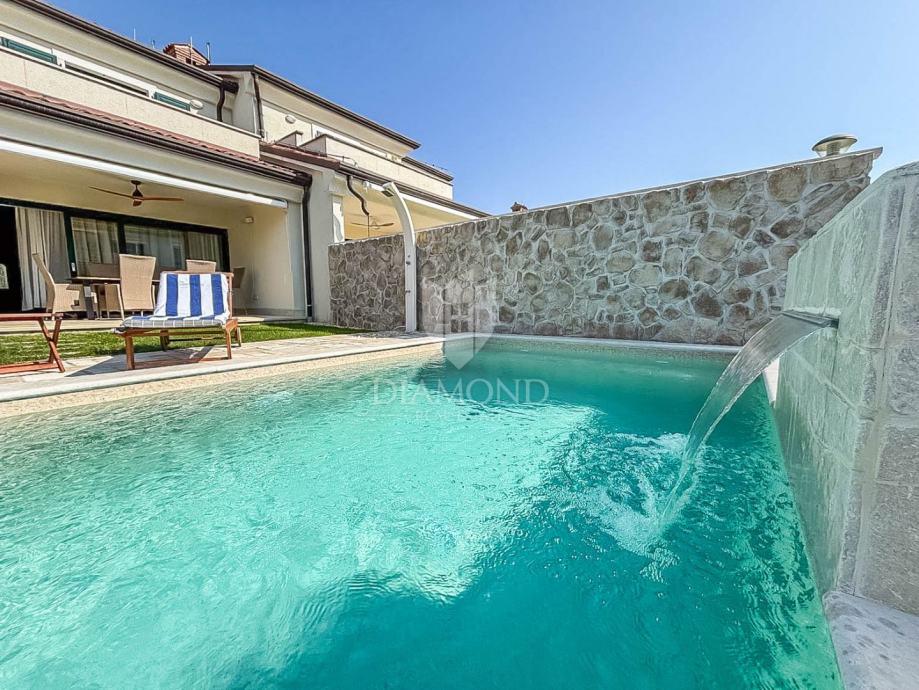 Na izuzetno mirnoj lokaciji, u kompletno ograđenom i privatnom naselju okruženom luksuznim vilama smjestila se ova prekrasna dvojna kuća. Naselju mogu pristupiti samo vlasnici kuća što osigurava maksimalnu privatnost i traženi mir. Sama kuća se prostire preko 250m2 uz ograđeni vrt gdje je smješten bazen i uređena alatnica.