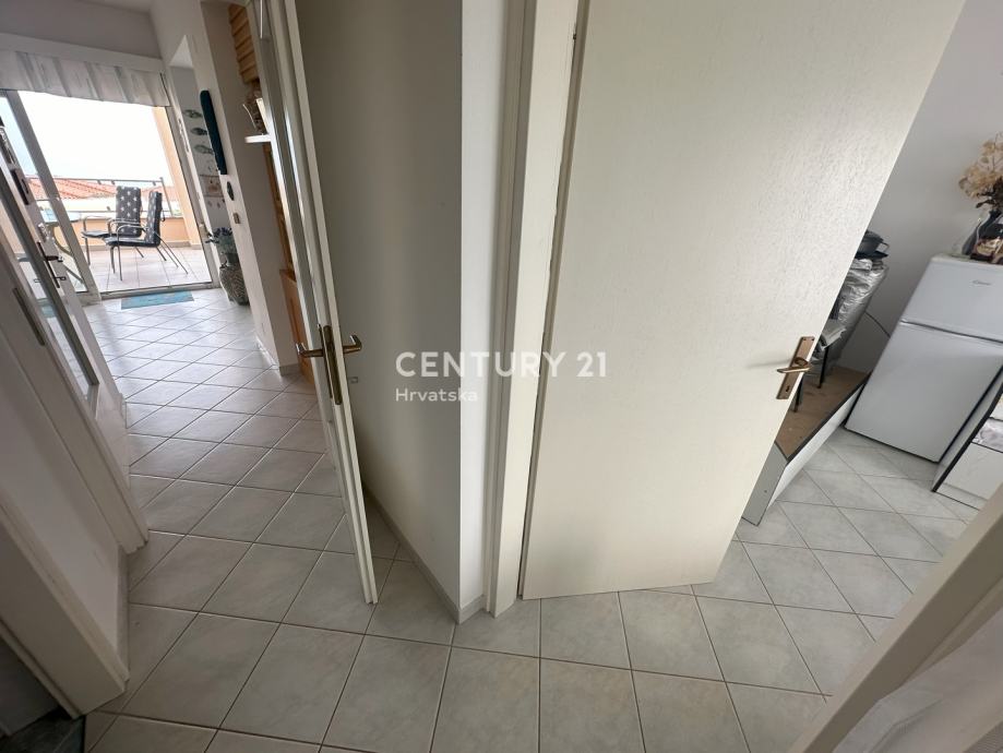 Raspored prostorija: Predsoblje, dječja soba, glavna spavaća soba s izlazom na balkon, kuhinja povezena s dnevnim boravkom - izlaz na veliku terasu s istočnom orijentacijom i predivnim pogledom na more.